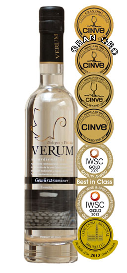 - El aguardiente de uva Gewürztráminer VERUM acumula 4 medallas de oro y gran oro en las 4 participaciones del concurso internacional de vinos y espirituosos CINVE, donde además ha sido premiado Verum Roble 2011 con medalla de plata.