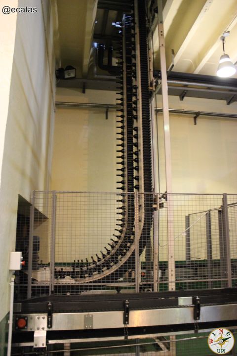 Ya de vuelta a la bodega, hacemos el recorrido habitual, seguimos los pasos de la entrada de la uva: mesas de selección, prensas, depósitos… lo habitual en una bodega concebida para el trabajo. Me llama la atención la línea de embotellado. Por razones de espacio está en una nave con dos niveles, lo que les obligó a desarrollar un sistema de “cadenas” diferente para mover las botellas de una planta a otra. Es curioso ver como de la necesidad se hace virtud y por lo visto, en Bodegas LAN están habituados a la innovación y a superar retos.