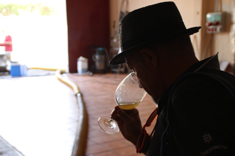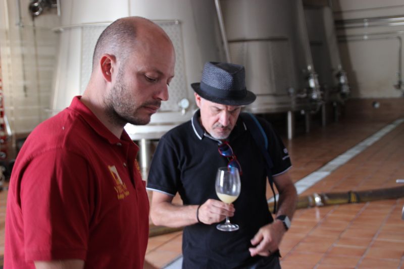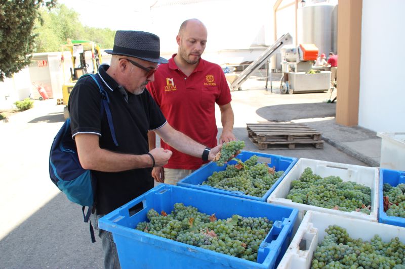 De vuelta a la bodega, pudo comprobar el proceso de selección de la uva: doble mesa, una para racimos y otra para granos de uva. Probar los mostos de las variedades vendimiadas, pasear por las instalaciones y conocer los procesos de destilación y por último, un recorrido por la cueva de crianza que alberga los vinos de la bodega y las holandas y aguardientes de Destilerías Altosa.