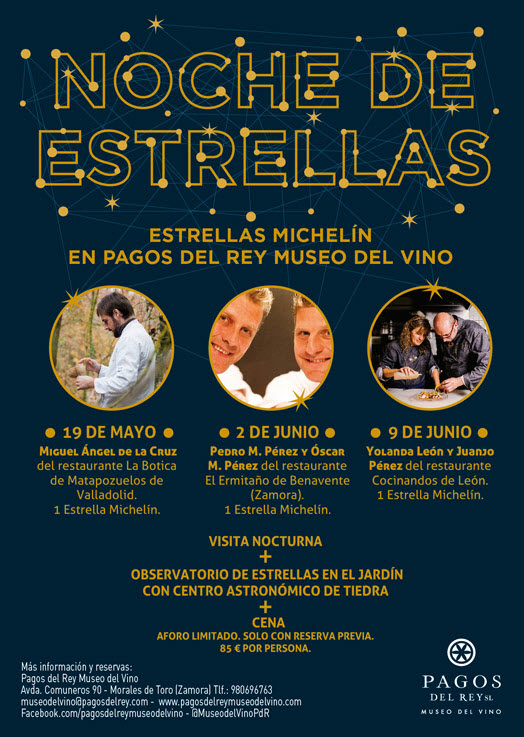 Morales de Toro, 14 de abril de 2016.- Pagos del Rey Museo del Vino ha programado tres noches inolvidables bajo el título ‘Noche de Estrellas’ en las que tres cocineros con estrella Michelin cocinarán en exclusiva para los asistentes al museo del vino los días 19 de mayo, 2 y 9 de junio.