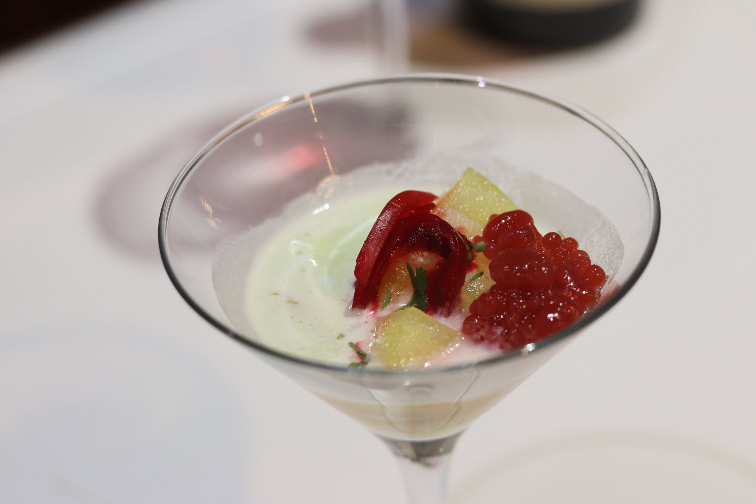 La segunda propuesta es una copa de bonito ahumado con ensaladilla “la Seu” y rosquilleta valenciana que acompaña a Beronia Rueda Verdejo 2017 de Bodegas Beronia. Entramos en territorio verdejo, pero verdejo de verdad. Un vino que representa lo mejor de la variedad. Intenso en nariz y en boca con presencia suficiente para bailar a la perfección con el plato. El sutil toque de amargor potencia la sensación del vino en boca