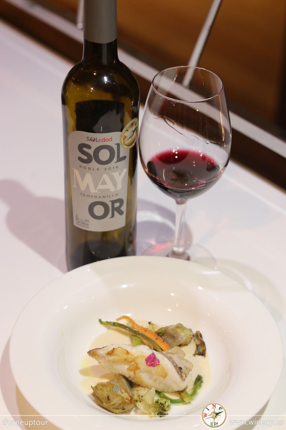 Rompamos los tópicos del maridaje, por eso el siguiente plato: Pescado de Denia con bosque de verduras y su bullit lo armonizamos con Solmayor Tempranillo Roble 2016 de Bodegas La Soledad (D.O. Uclés). Como digo, un vino fresco, cargado de frutos rojos que ya se perciben cuando se sirve en la copa. En boca la expresión que mejor lo define es sedosidad y frescura. Un vino tinto para disfrutar, tanto con carnes como con pescados.