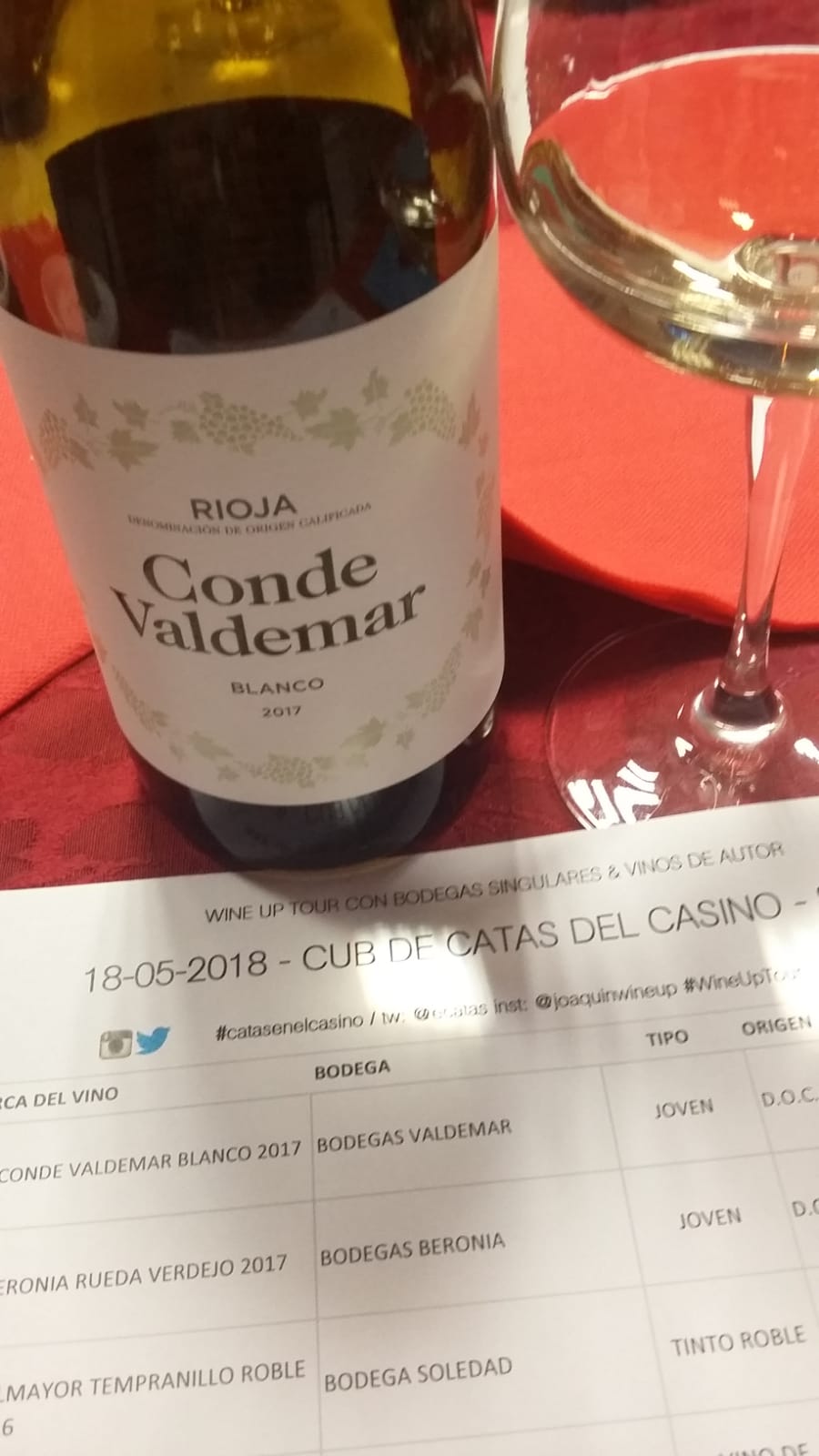 Conde Valdemar Blanco 2017 de Bodegas Valdemar (D.O.C. Rioja). En la cata pudimos destacar su carácter floral y la frescura, un vino muy apropiado para nuestro clima cálido y con el que se demuestra que en Rioja, también hay excelentes vinos blancos, vinos para todos los gustos y cuando hablamos de bodegas Valdemar, siempre con garantía de disfrute.