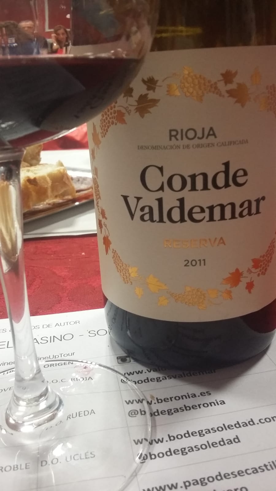 Conde Valdemar Reserva 2011 de Bodegas Valdemar (D.O.C. Rioja). La cata terminó con un reserva que reafirma a los que son amantes del buen vino de Rioja. También tiene la capacidad de aficionar a los que están dando sus primeros pasos en el mundo del vino con atributos como su recuerdo a especias dulces, buena acidez, equilibrio y persistencia. Sobresaliente!