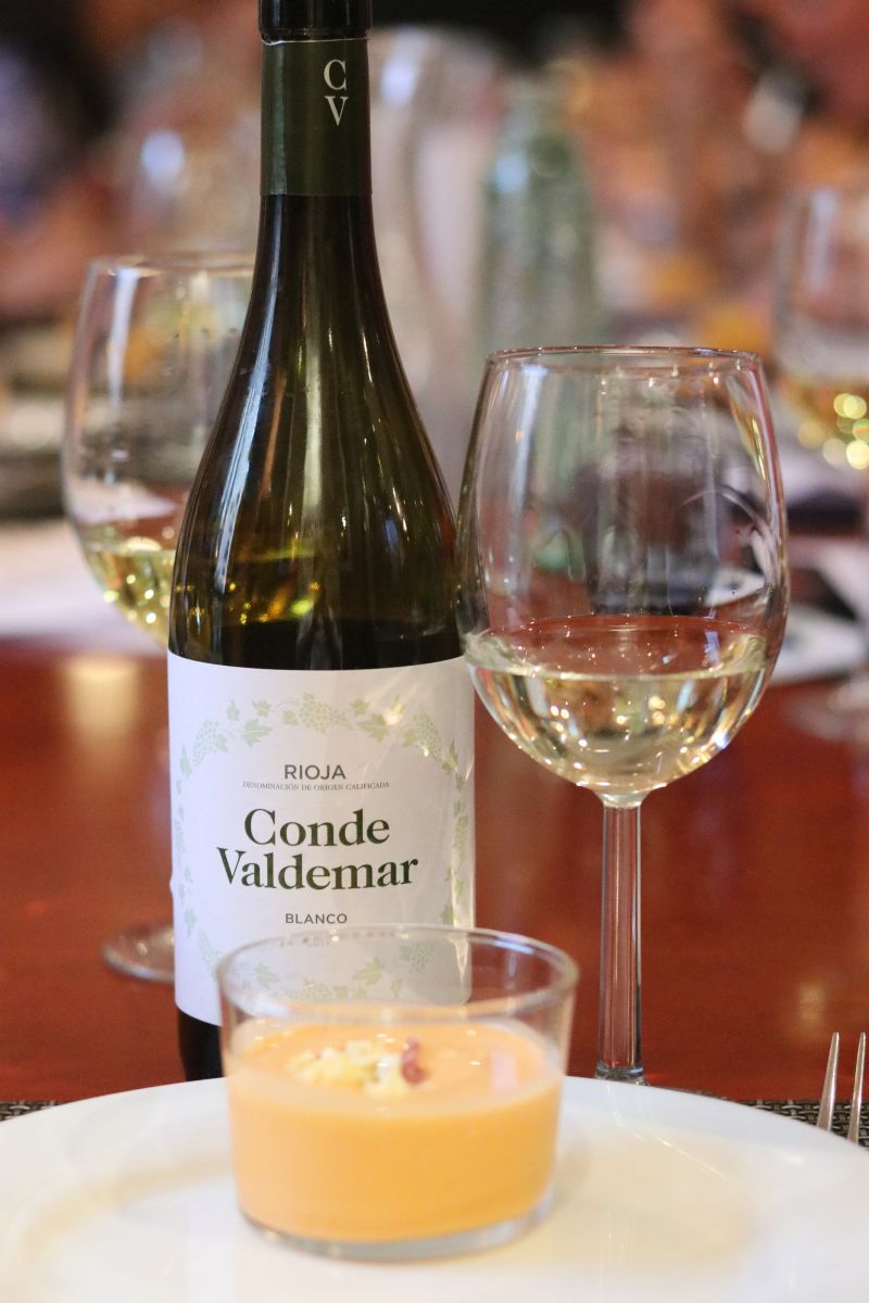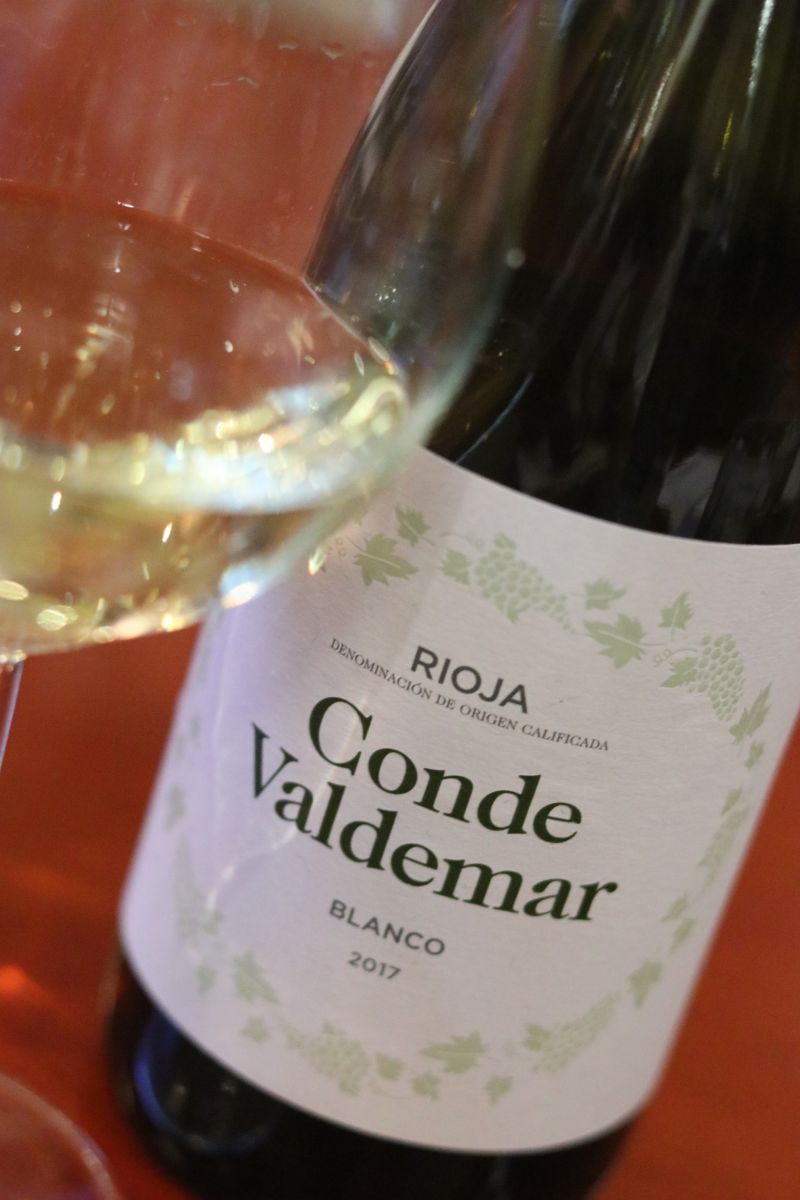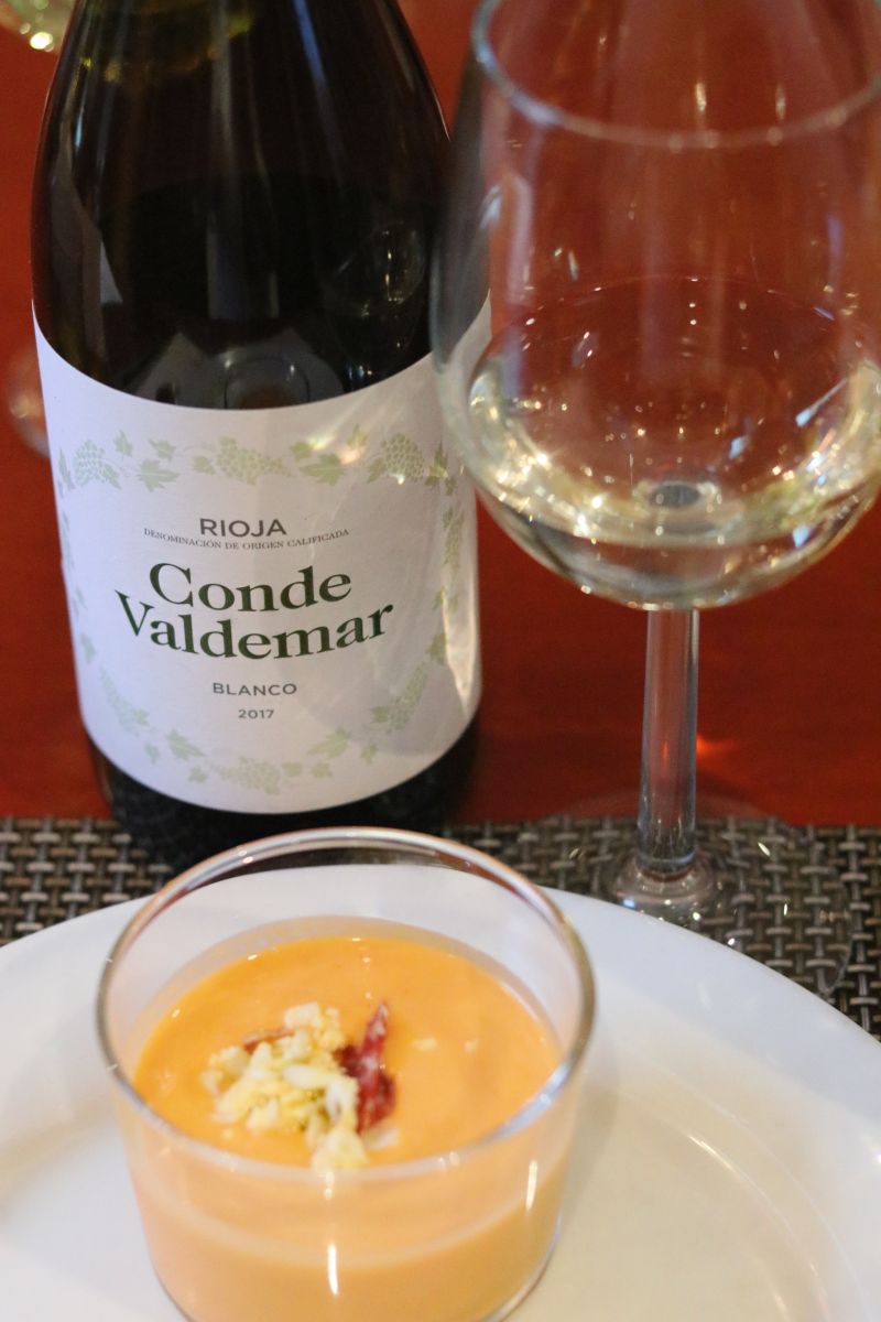 Conde Valdemar Blanco 2017 de Bodegas Valdemar (D.O.Ca. Rioja). Elaborado con Viura principalmente y un pequeño porcentaje de tempranillo blanco, verdejo y sauvignon blanc. Destacan las flores blancas, manzana, pera y un sutil recuerdo de fruta tropical. En boca es amable, buena acidez Con el salmorejo acompaña perfectamente. Un blanco versátil que nos permitirá disfrutar con ensaladas y pescados blancos.