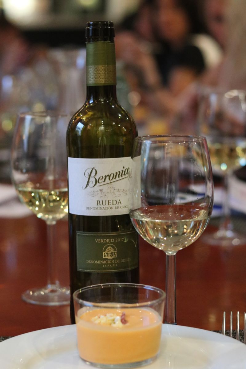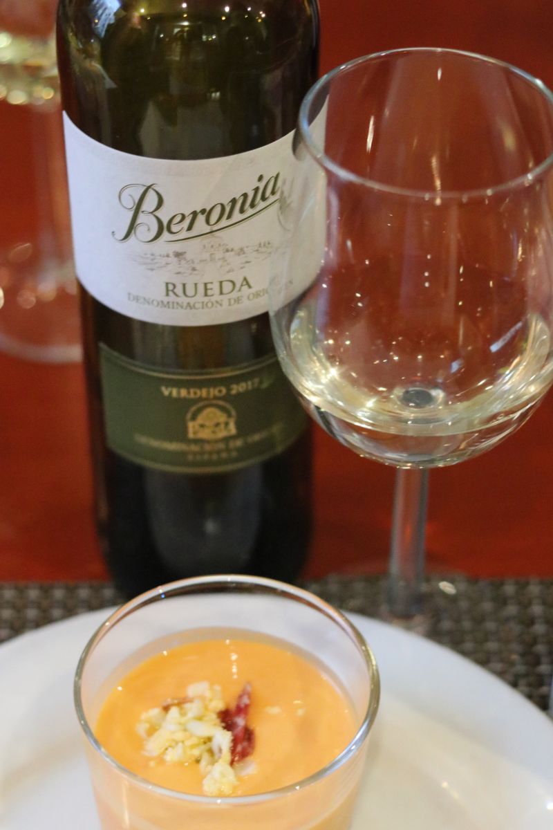 Beronia Rueda Verdejo 2017 de Bodegas Beronia (D.O. Rueda). Verdejo 100%, elaborado con dos vendimias sobre la misma parcela nos permite disfrutar año tras año (esta es su 3ª añada) de un vino muy bien trabajado y que representa las virtudes de esta variedad. Con el salmorejo no podía ir mejor. Un sutil amargor que prolonga la sensación del vino en boca. Buena intensidad aromática y persistencia.