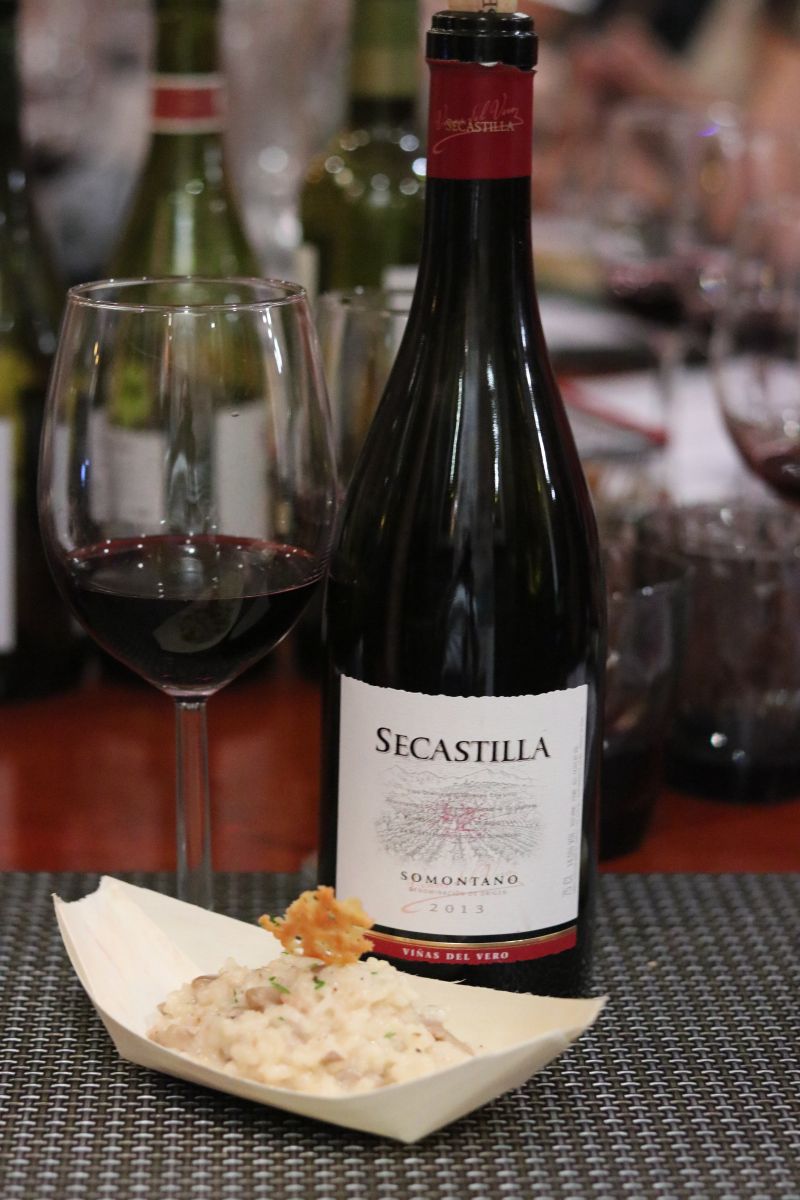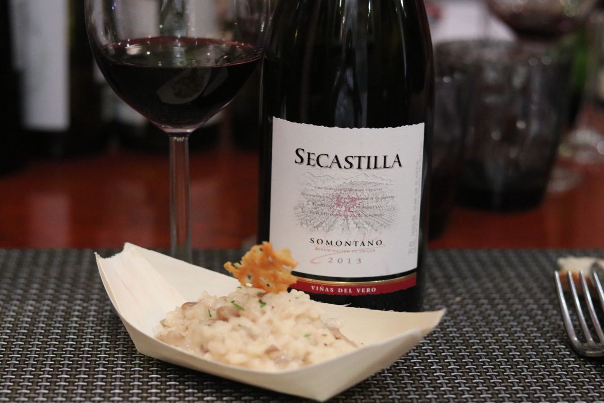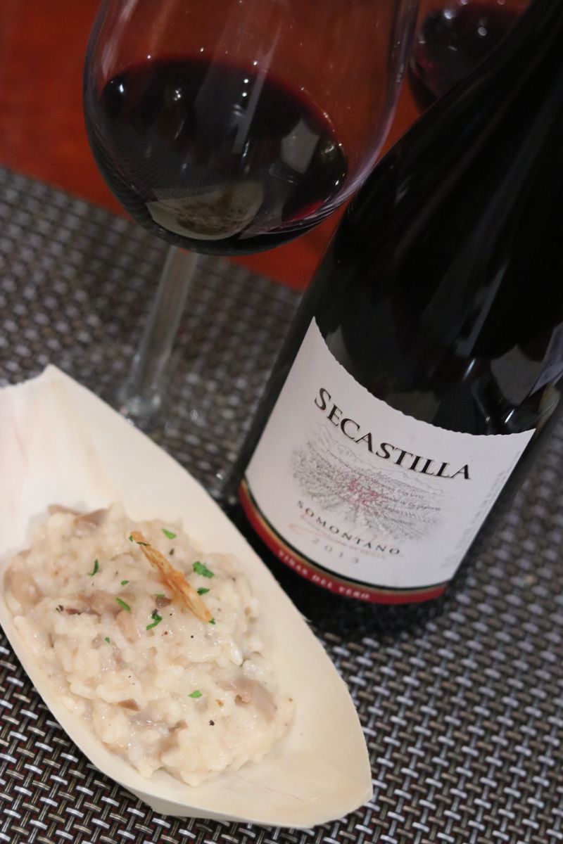 Secastilla 2013 de Pago de Secastilla – Viñas del Vero (D.O. Somontano) fue la segunda propuesta para este risotto. Este garnacha 100% con 10 meses de crianza es un descubrimiento para todo aquel que lo prueba. En nariz aparecen aromas terrosos, fruta negra, regaliz y en boca se descubre frescura, intensidad, un vino sedoso que acaricia y permanece en retrogusto. Con esta intensidad, el risotto y lo que le pongas.
