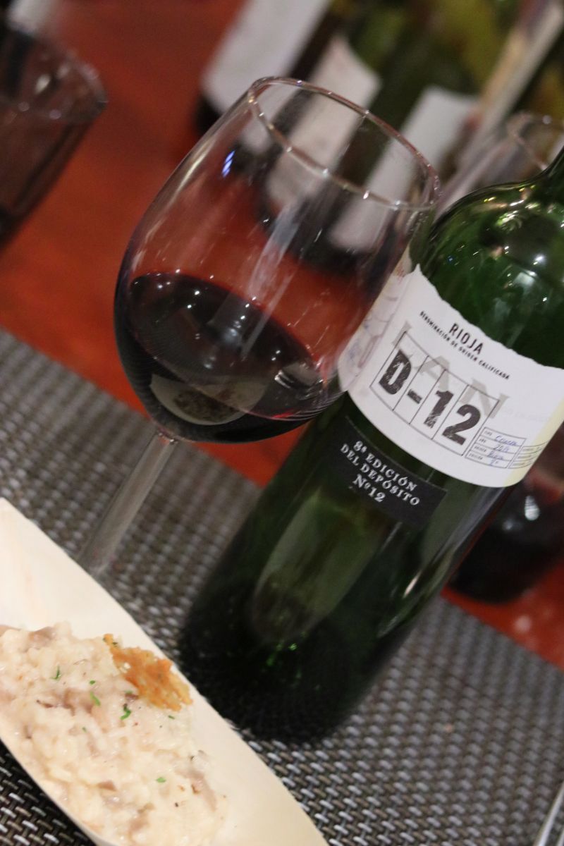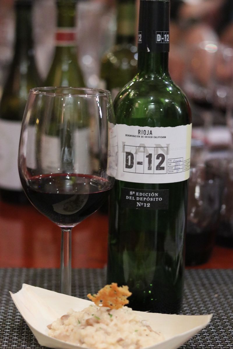 LAN D12 2014 de Bodegas LAN (D.O.Ca Rioja). Un tempranillo con 12 meses de crianza que busca la integración entre la fruta y la madera, las especias y el cacao con una boca redonda. Su intensidad acompaña a este risotto para que los recuerdos de frutas y especias complementen el sabor de las setas. Por otro lado, su acidez y frescura en boca hace que cada trago sea una experiencia. Una copa te pide otra copa.