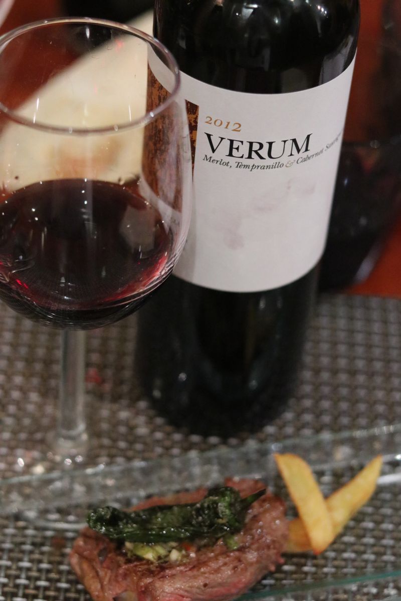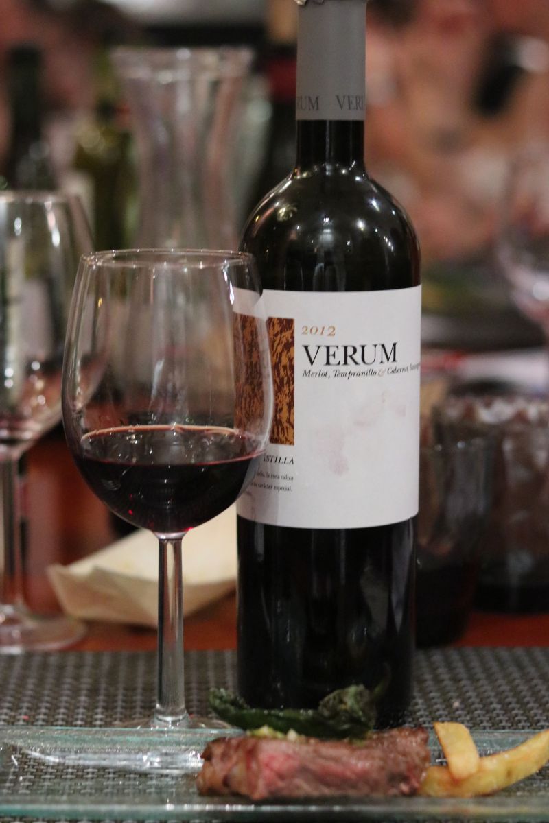 Para el entrecot disfrutamos de otro vino que sorprende: Verum 2012 de Bodegas y Viñedos Verum (Vino de la tierra de Castilla). Un coupage de merlot, tempranillo y cabernet Sauvignon con 12 meses de crianza en roble francés. ¿Quién dijo que los vinos de castilla la mancha no envejecen bien?. Las palabras para describir este vino es finura y elegancia.