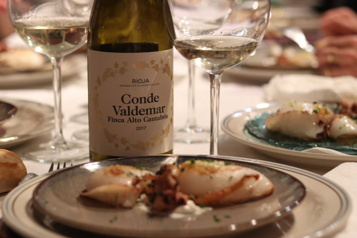 La cena se iba animando y las expectativas estaban por todo lo alto sin defraudar. Para el tercer blanco y disfrute de los asistentes, Sepionet al ajillo destacando la potencia de sabor y la textura que conjugaban a la perfección con la elegancia e intensidad de Conde Valdemar Finca Alto Cantabria fermentado en barrica 2017 de Bodegas Valdemar (D.O.Ca. Rioja). Este blanco con alma de tinto destaca por su acidez, frescura e intensidad. Válido para esta sepia y perfecto para una carne.