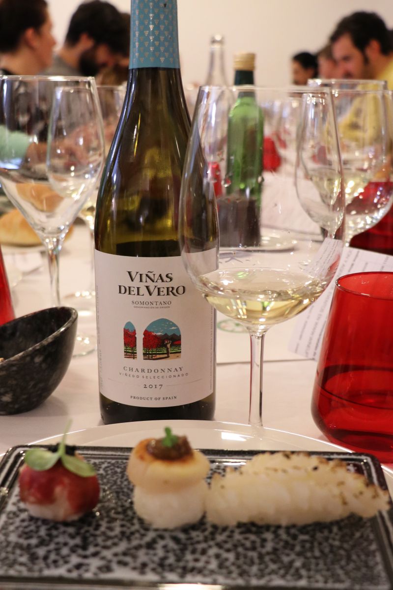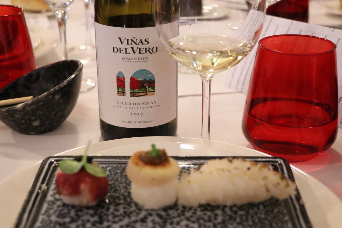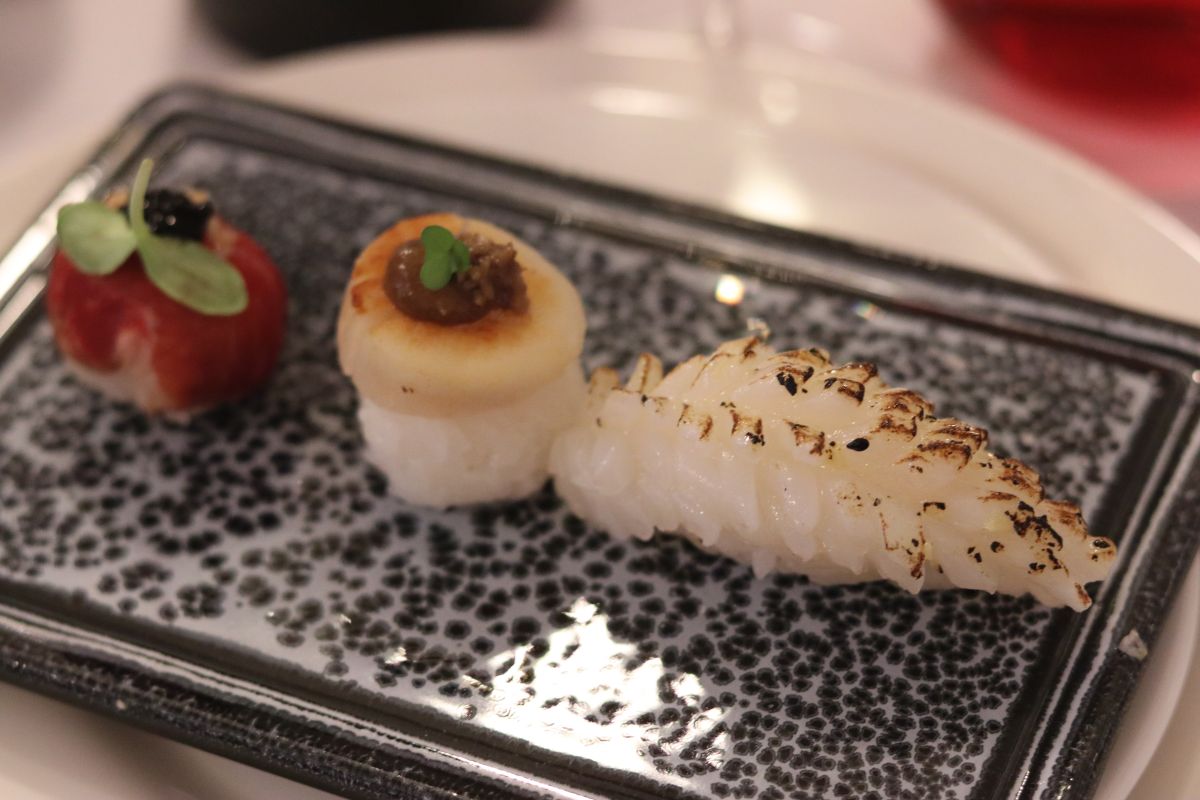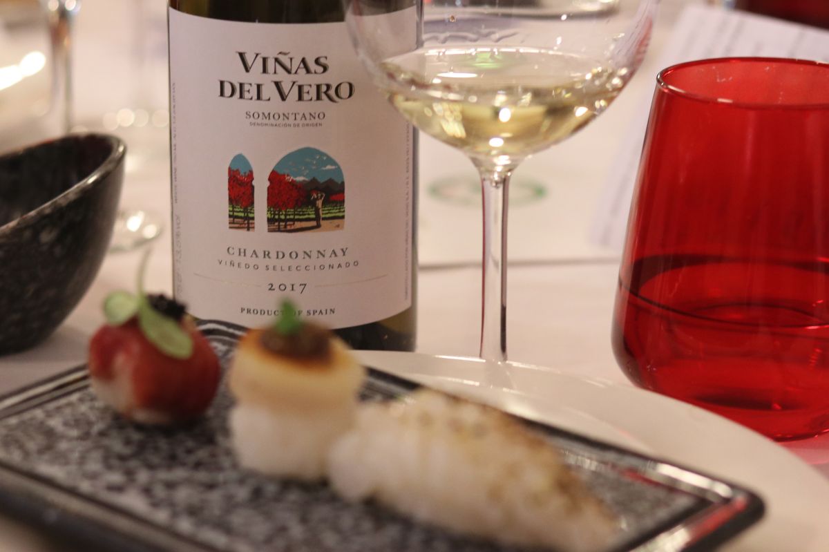 Trío de niguiris (calamar soasado, vieira y presa de bellota) con Viñas del Vero Colección Chardonnay 2017 de Viñas del Vero (D.O. Somontano)