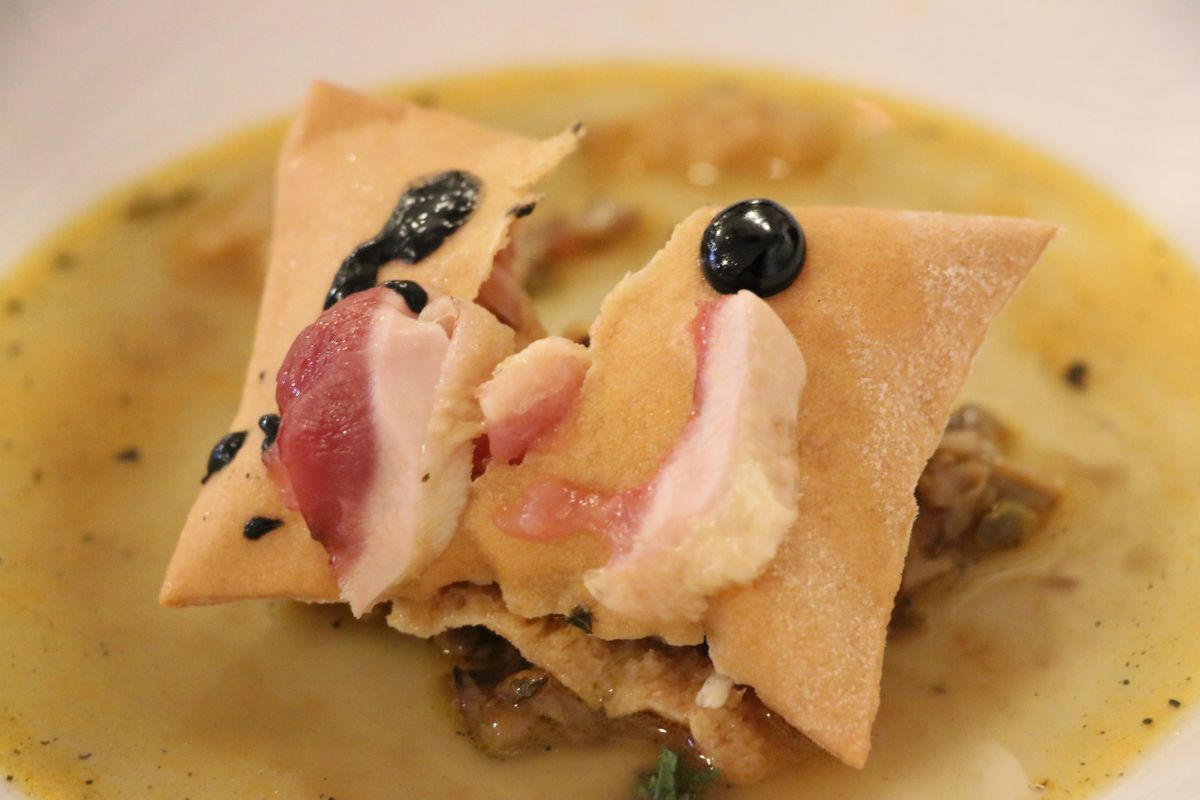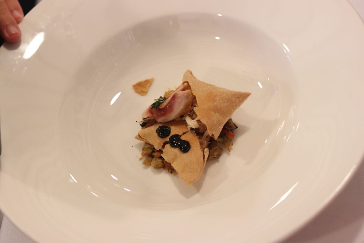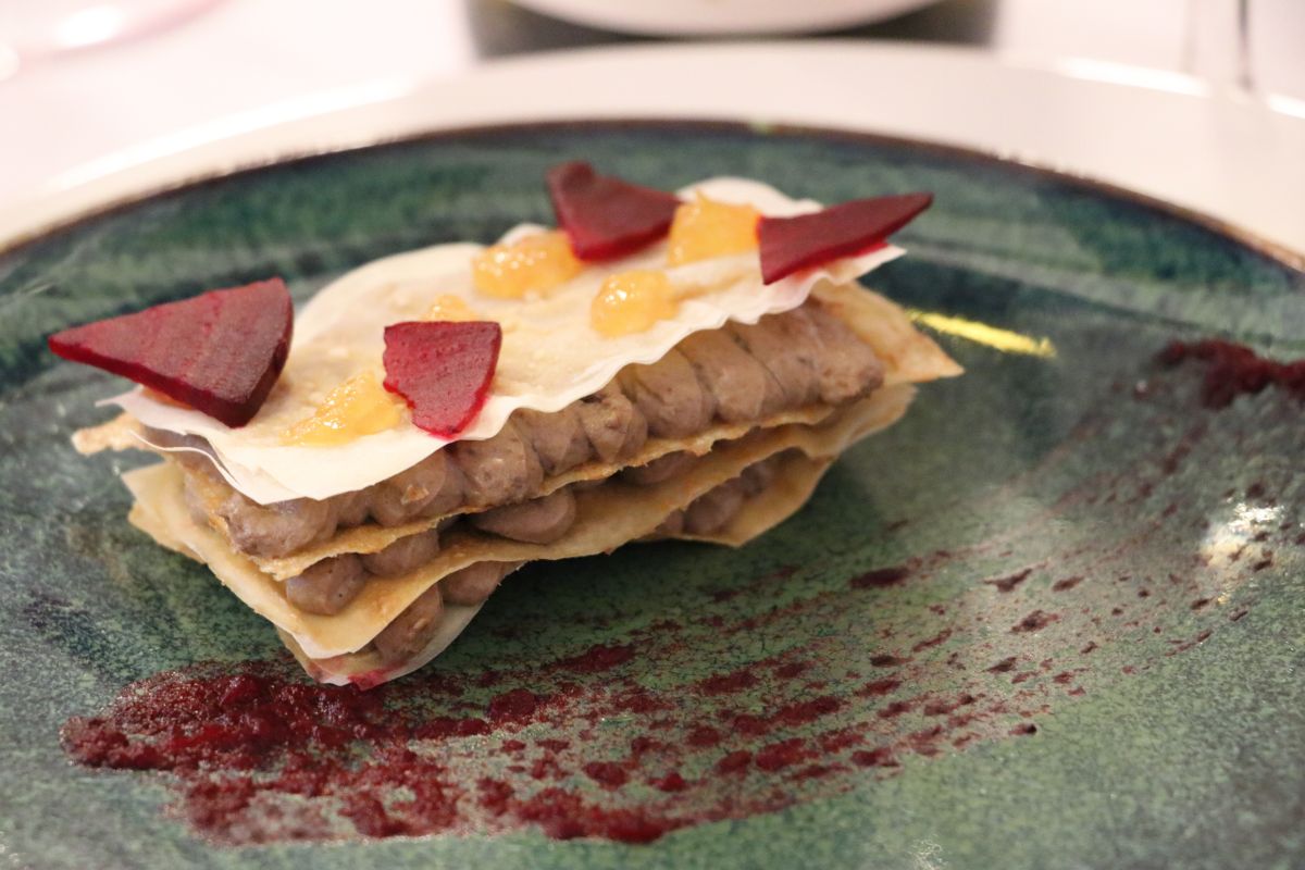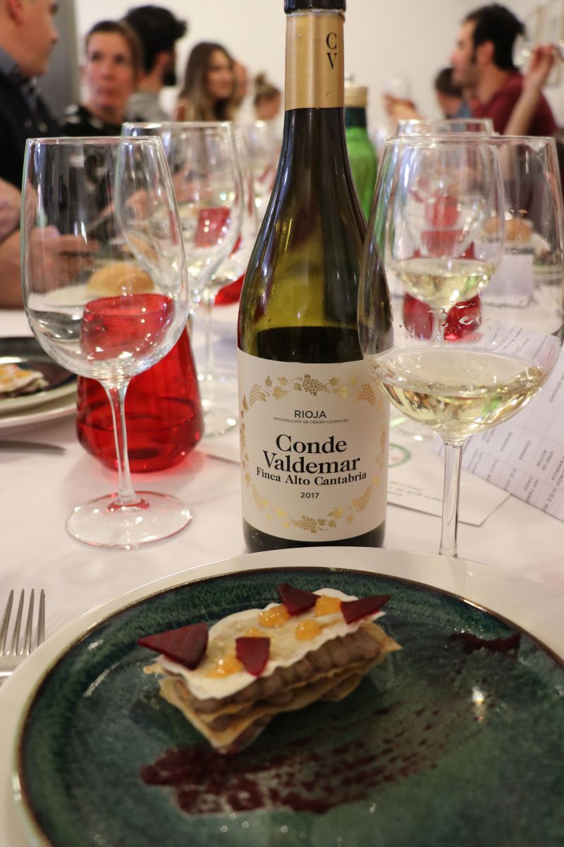 Milhoja de paté de caza y calabaza con Conde Valdemar Finca Alto Cantabria Fermentado En Barrica 2017 (Viura) de Bodegas Valdemar (D.O.C. Rioja)