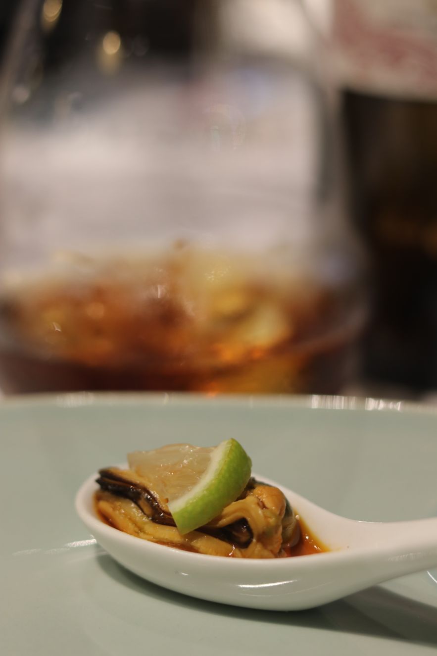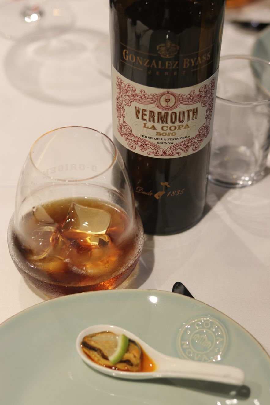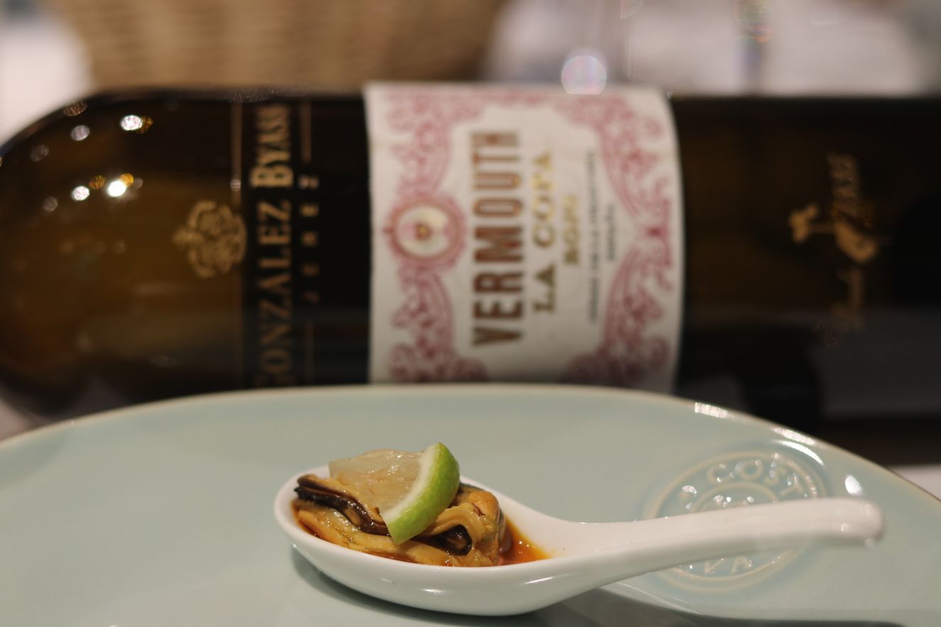 La cena comenzó con Vermouth Rojo La Copa de González Byass que se acompañó con mejillón Ramón Franco en escabeche. Un vermouth equilibrado e intenso, en nariz un carácter cítrico y de hierbas aromáticas. En boca, saca su carácter de vino de jerez que te hace disfrutar con un amargor medio y retrogusto intenso.