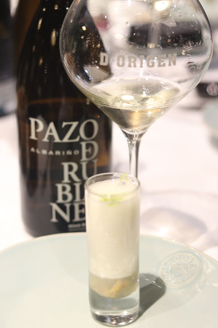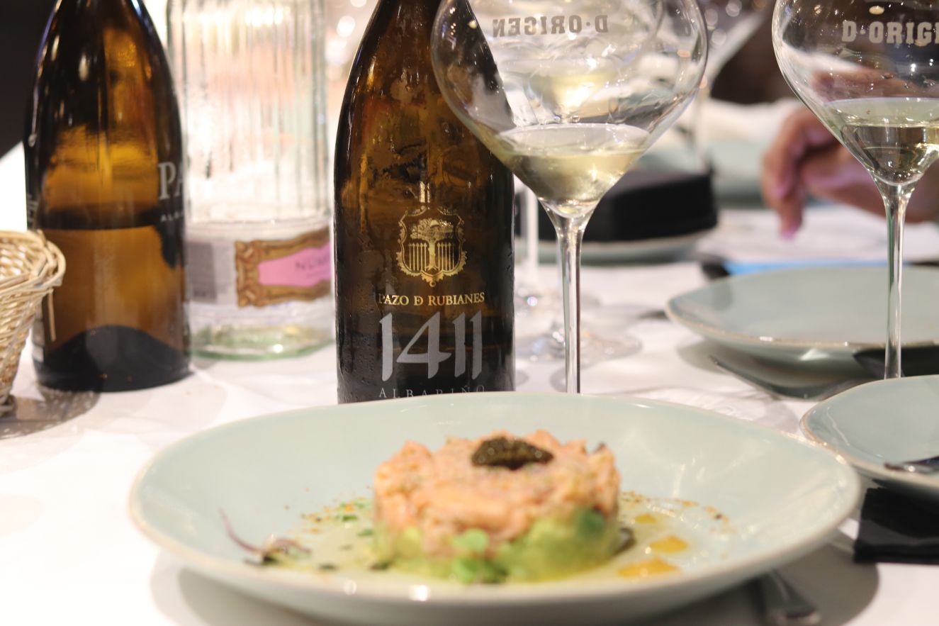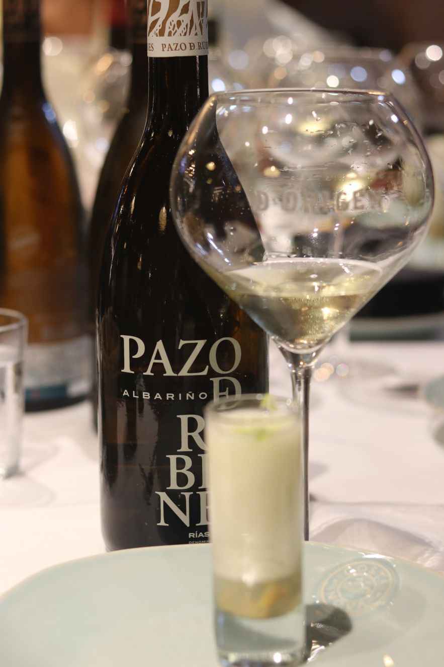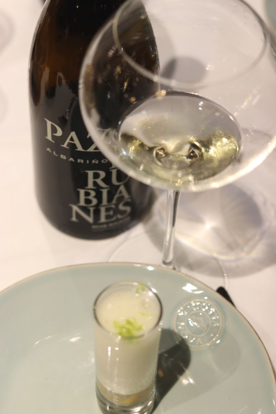 Dos vinos excelentes de la bodega más visitada en Galicia. Pazo de Rubianes 2017 albariño y Pazo de Rubianes 1411 2017 albariño sobre lías de Pazo de Rubianes (D.O. Rías Baixas) armonizado con Berberechos de las rías gallegas con espuma de cítricos y Tartar de salmón noruego ahumado y caviar de esturión.