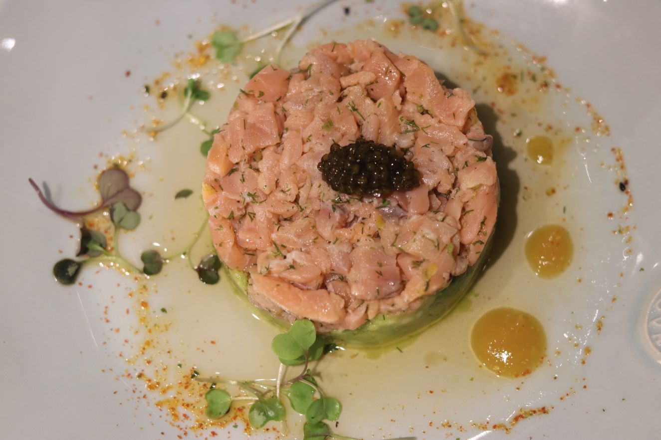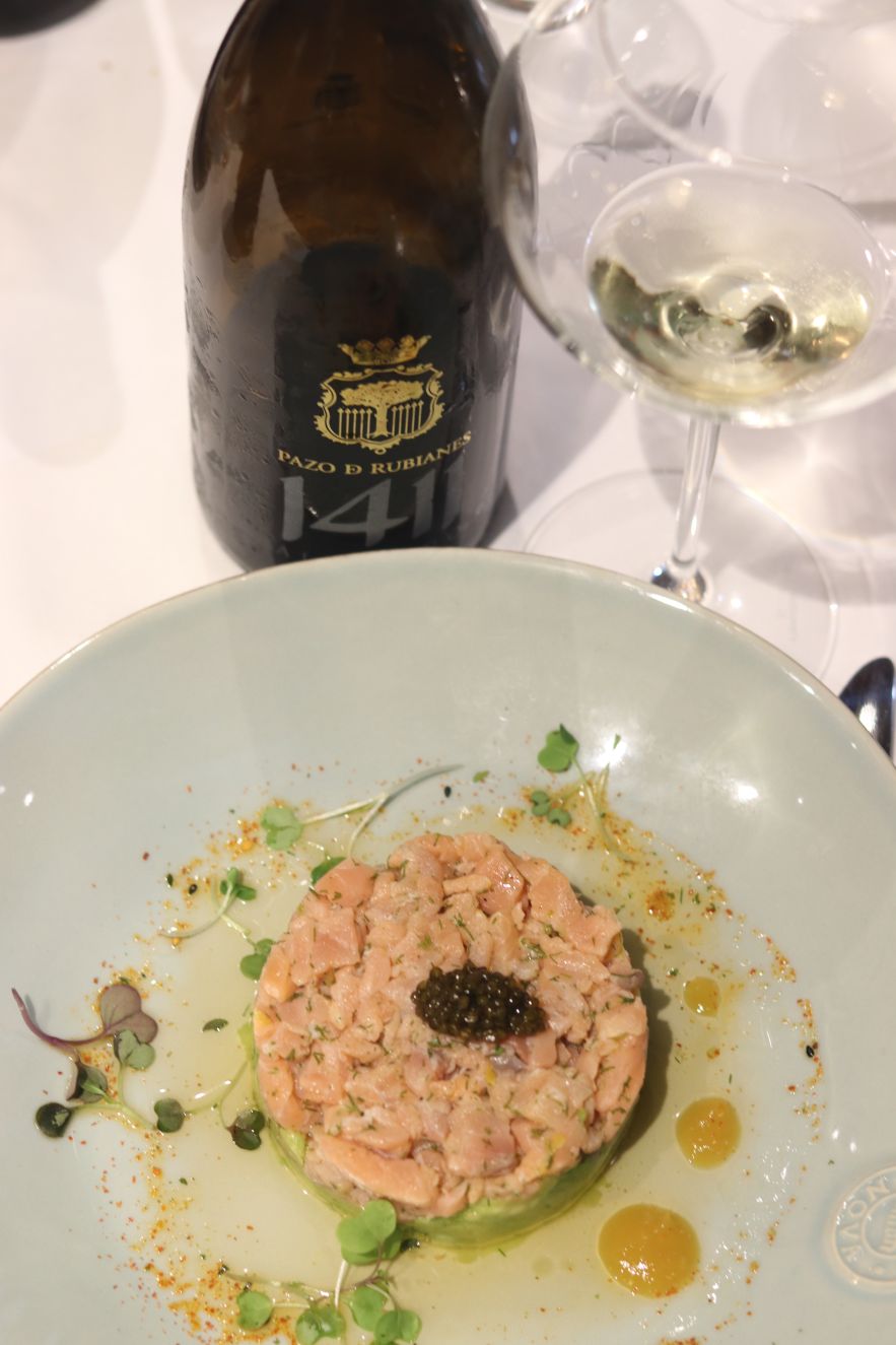 Los berberechos con espuma de cítricos tenían todo lo bueno del mar que con Pazo Rubianes te llevaba en la memoria a través de los aromas y el sabor a las Rías Baixas. El Tartar de Salmón, probablemente sea el mejor que haya comido nunca, por la buena ejecución pero también incluye el vino que lo acompañaba. En ambos casos, destaca una nariz cítrica, mineral y de flores blancas. En boca buena acidez y estructura que se potencia con la intensidad del retrogusto. Vinos parecidos pero en los que el paso por lías de 1411 aporta una estructura y untuosidad superior en boca.