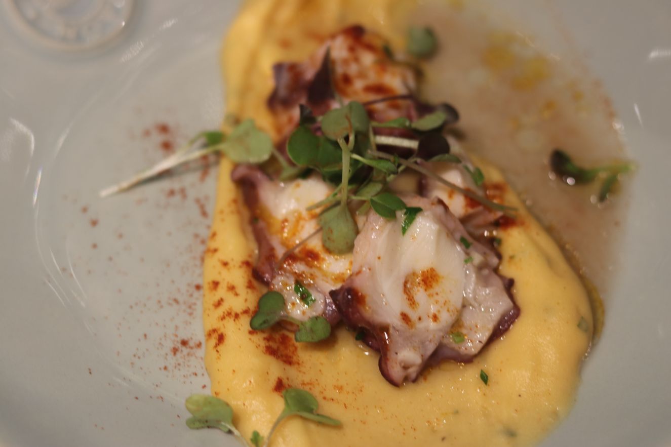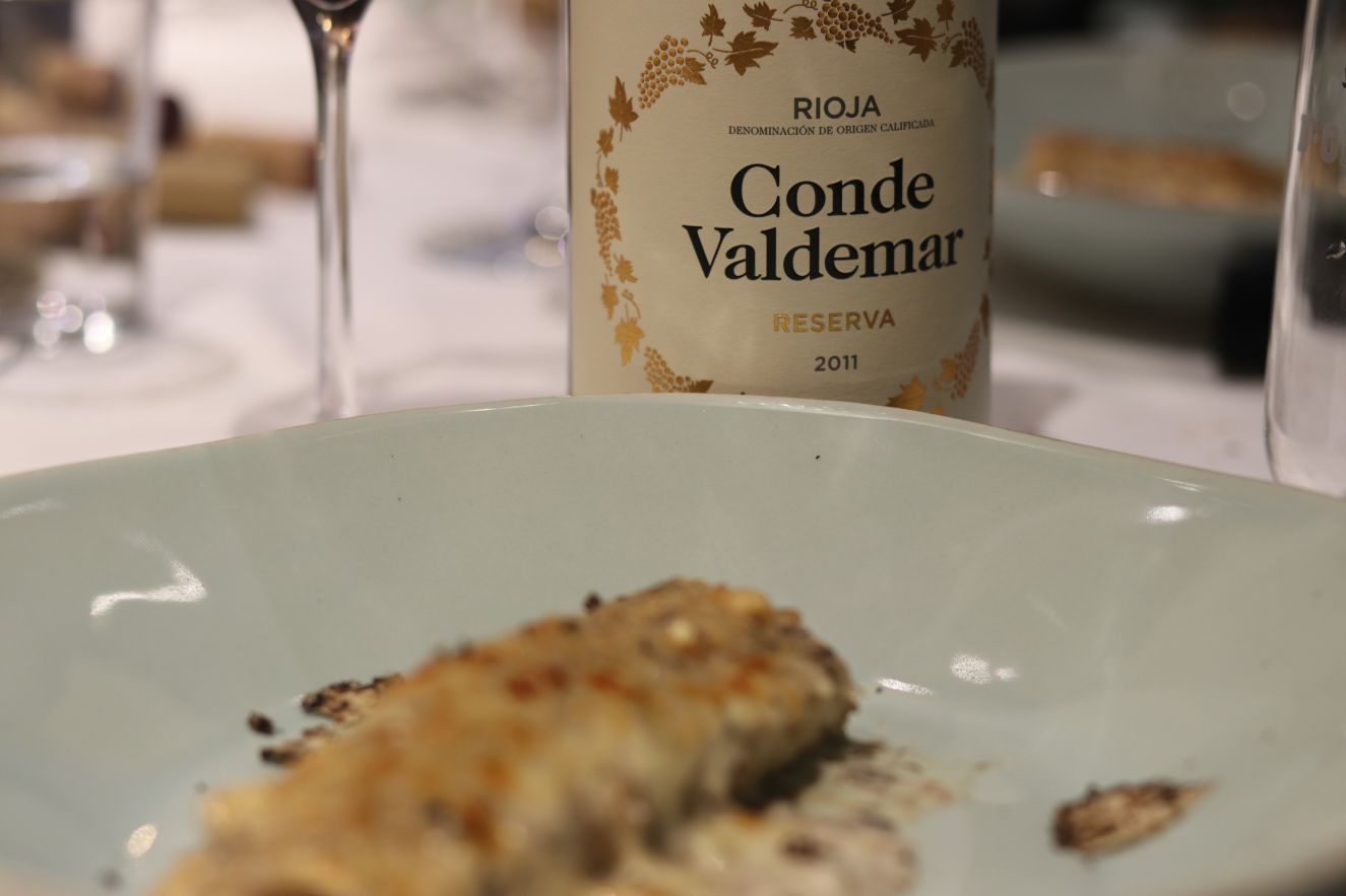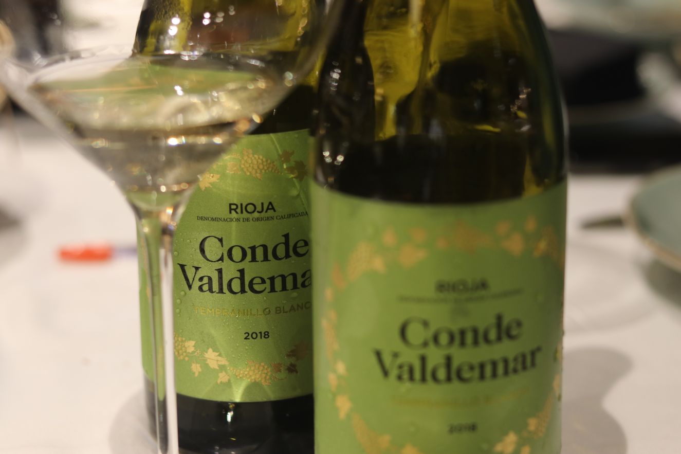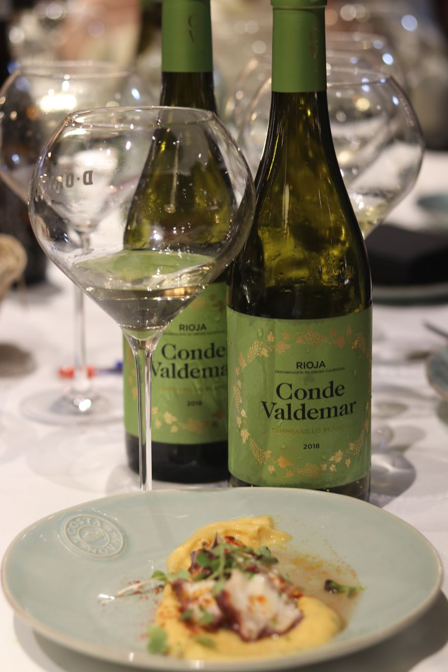 En Rioja también se encuentran grandes vinos blancos. Conde Valdemar Tempranillo Blanco 2018 de Bodegas Valdemar (D.O.Ca. Rioja) se armonizó con un plato estrella, el pulpo a feira. Los comensales quedaron sorprendidos por la frescura e intensos recuerdos de flores blancas y fruta como la pera o la manzana. Un vino blanco que abre el camino a otros blancos riojanos. Valdemar es la bodega que más años lleva trabajando la Tempranillo blanco, eso es un plus para comprenderla mucho mejor que el resto.