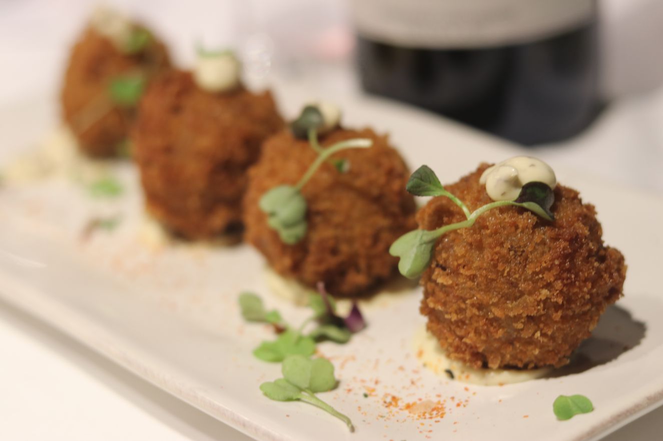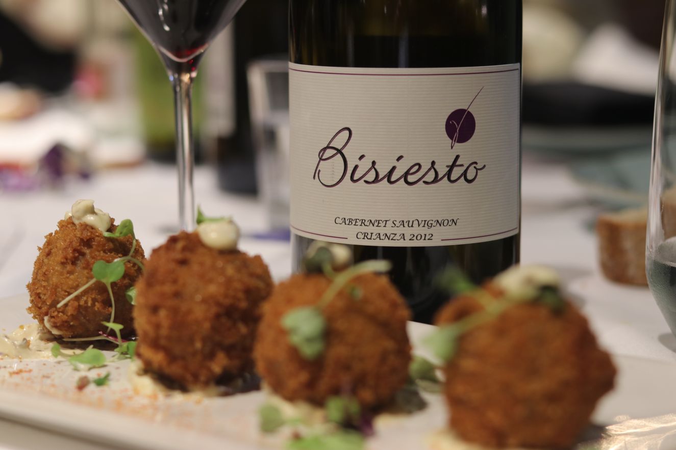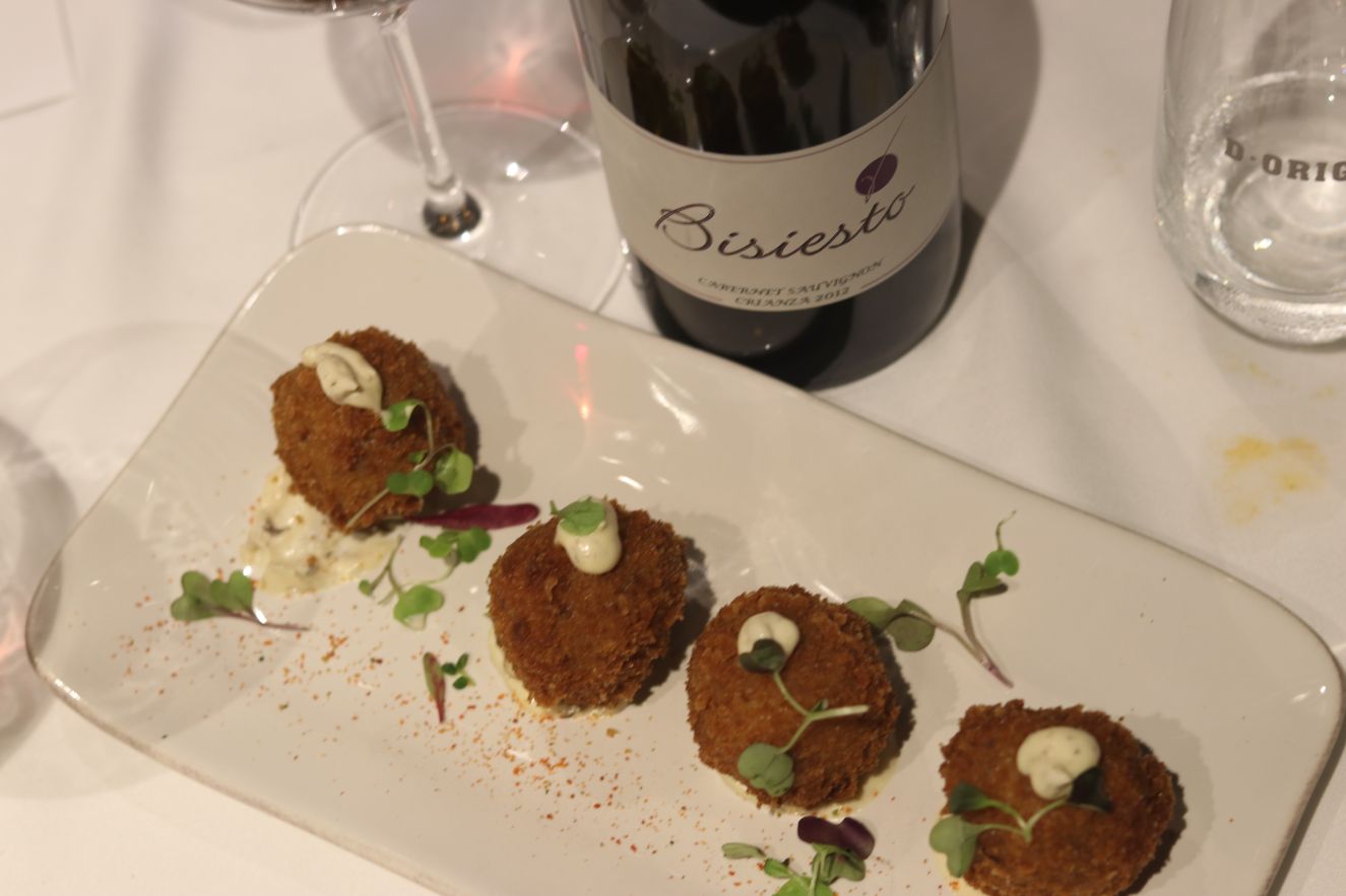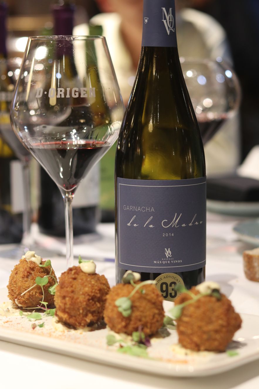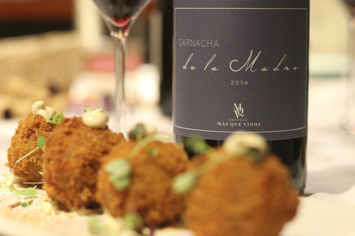 Los siguientes vinos se sirvieron a dúo, el maridaje o armonía se comprende mejor cuando se experimenta el mismo plato con dos vinos. El plato propuesto eran unas sublimes croquetas de carrillada. Textura y sabor irrepetibles… hay que probarlas! Para ello, jugamos con dos vinos sublimes de Castilla-La Mancha. La delicadeza y carga frutal de La garnacha de la madre de Bodegas más que vinos (VT Castilla) y la intensidad y estructura de Bisiesto Cabernet 2012 de Bodega Soledad (D.O. Uclés). Dos vinos que muestran dos versiones diferentes con una perfecta ejecución. La garnacha era intensa en nariz destacando una boca fresca, cargada de fruta roja y muy persistente. Una de las mejores garnachas de la región. Con respecto a Bisiesto Cabernet, también hablo de la mejor versión de un cabernet Sauvignon en la región y de las mejores de España. En nariz balsámico y cargado de especias que en boca aportan frescor, tanino noble que juega con la textura de la croqueta para dejar un final de boca sorprendente e intenso. Para gustos los colores, yo me quedo con los dos vinos.