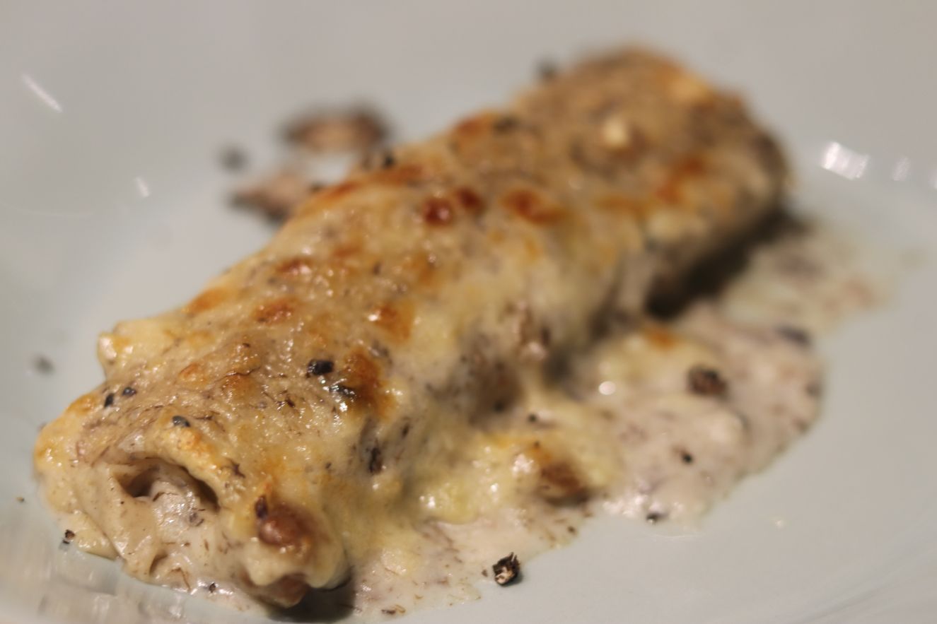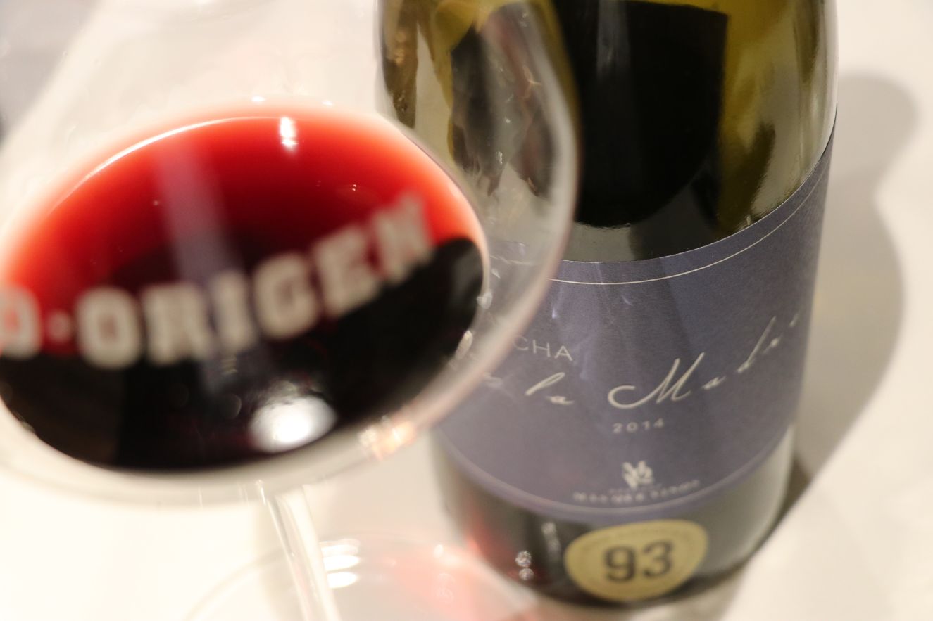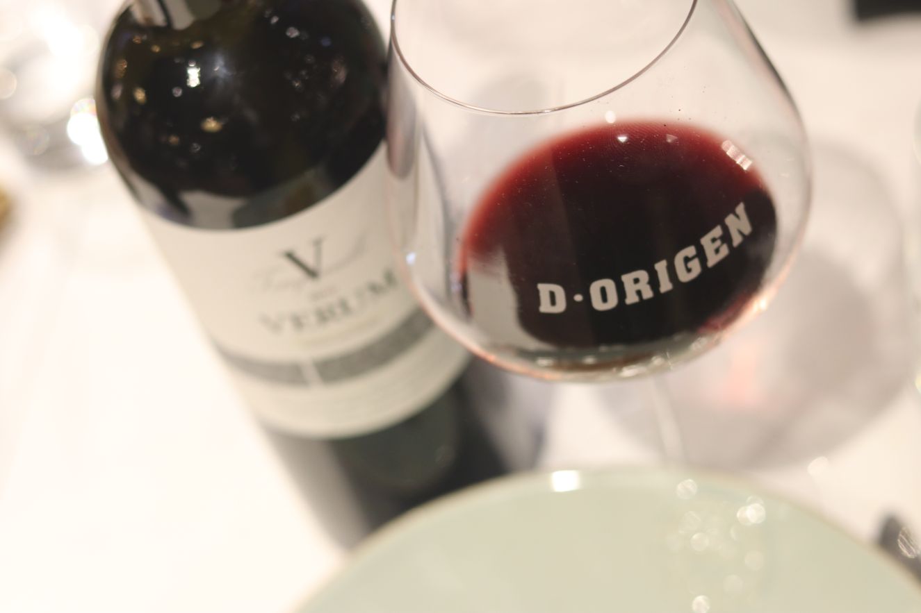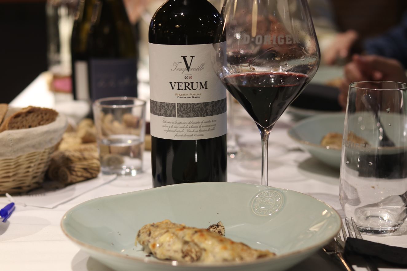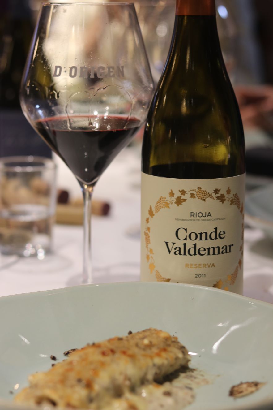 No es que vayamos de menos a más, pero en el servicio del vino hay que ir ganando en estructura e intensidad, y estas dos son entre otras más las virtudes de Conde Valdemar Reserva 2011 de Bodegas Valdemar (D.O.Ca. Rioja) y Verum Tempranillo reserva de familia 2010 de Bodegas Viñedos Verum (Vino de la tierra de Castilla). El plato que nos proponía D-Origen era un canelón de buey con salsa de nueces y trufa. Sin duda un acierto, un plato intenso, sabroso con el toque terroso que aporta la trufa que se vio recompensado en la armonía con ambos vinos. De Conde Valdemar Reserva destaco la frescura, el tanino pulido, sedosidad y persistencia. Un reserva que crea afición. De Verum Tempranillo reserva de familia destaco la elegancia e intensidad. Probablemente sea el cencibel (tempranillo) más premiado de Castilla-La Mancha. Una nariz intensa en la que destaca la fruta roja y mineral que da paso a una boca con tanino noble, estructura y frescura (para un vino de casi 9 años). Para repetir vinos y plato.