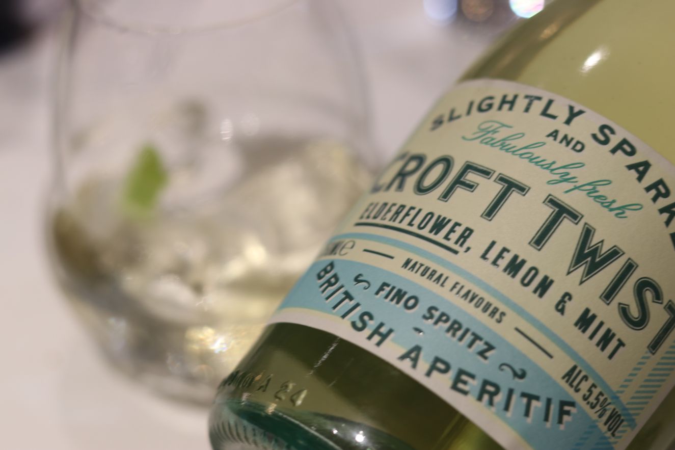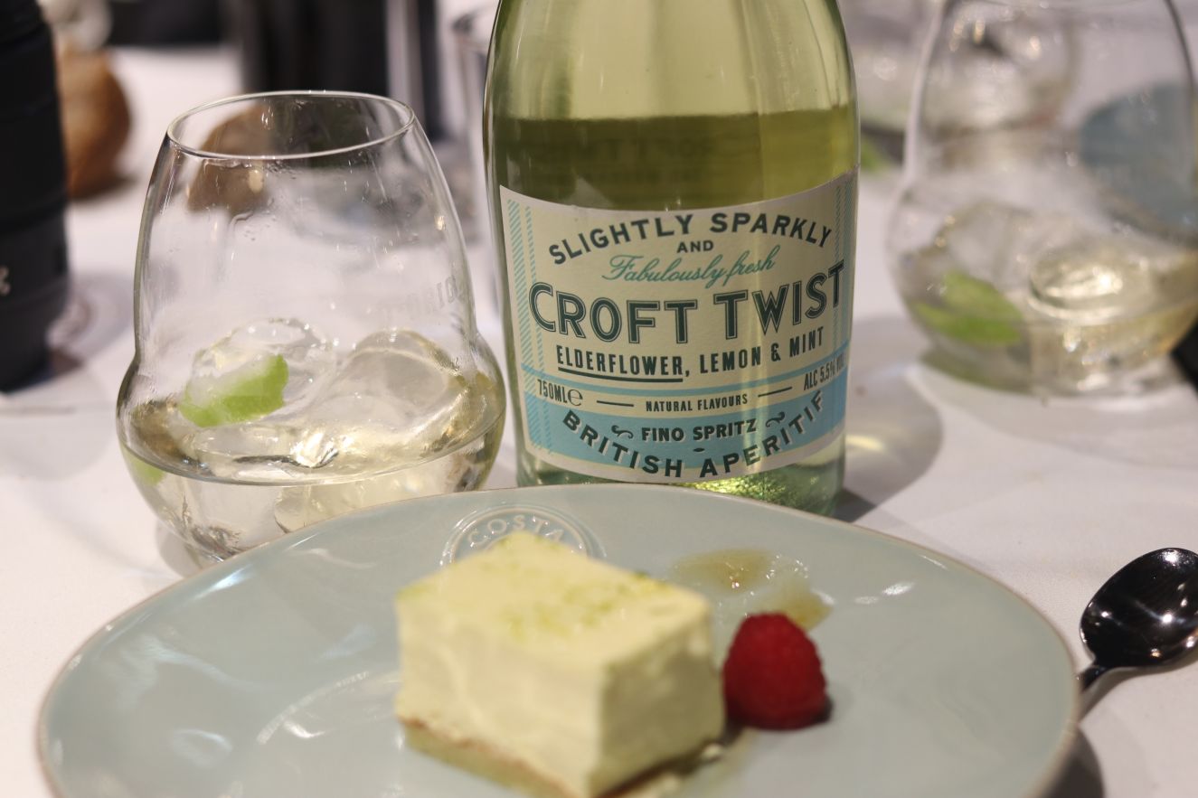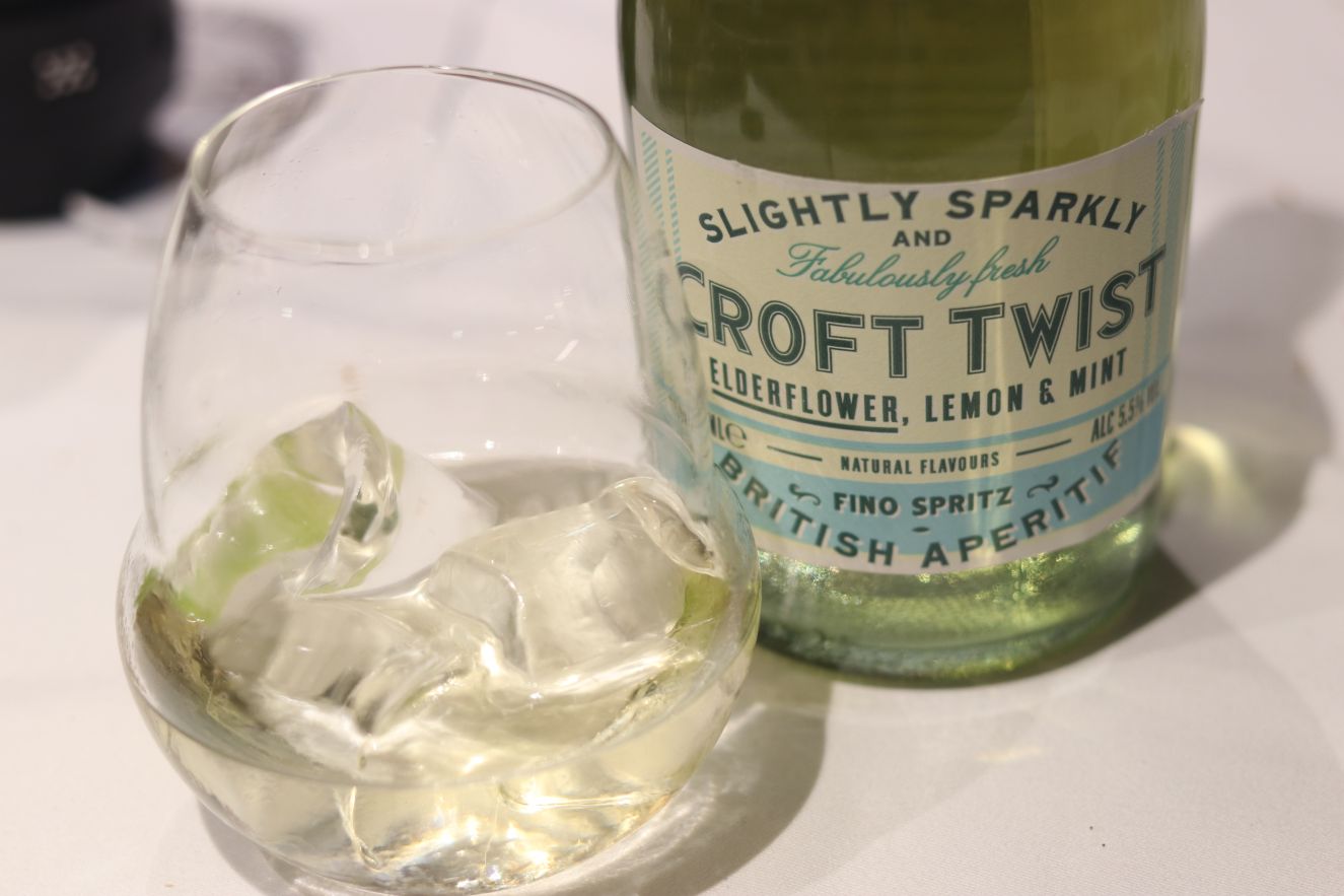 Después de la selección de vinos, había que terminar con algo ligero y refrescante. Hasta hacía poco no conocía Croft Twist fino de González Byass, pero en cuanto lo bebí, tuve claro que merecía la pena “contarse”, disfrutarse. Viene a ser un “coctel” de vino a base de fino con baja graduación y ligeramente carbónico que se acompaña de aromas de hierbabuena y menta. Es una versión mejorada del “rebujito” que disfrutamos con la tarta de lima D-Origen.