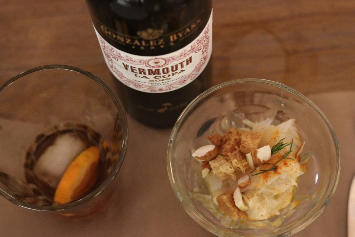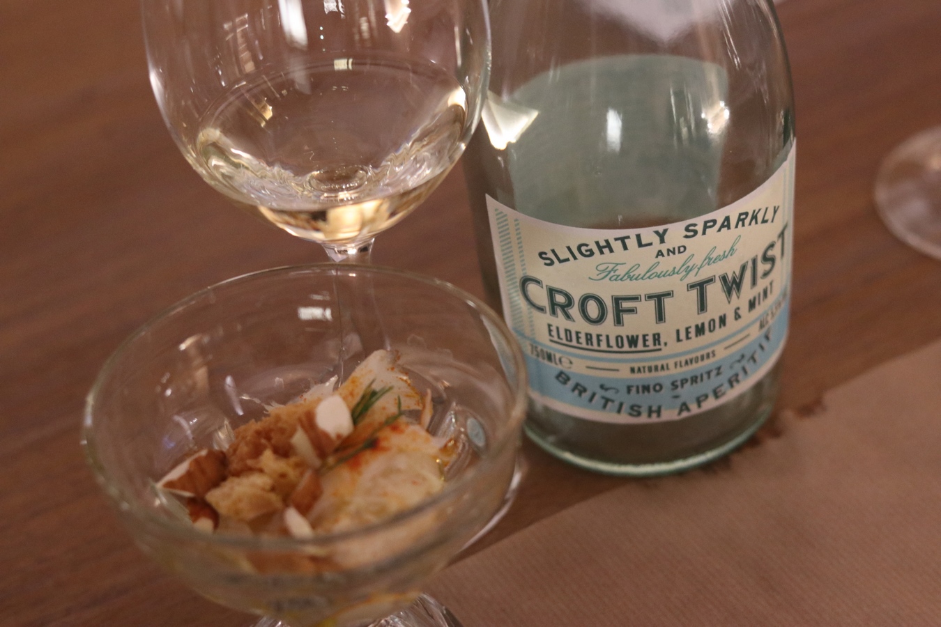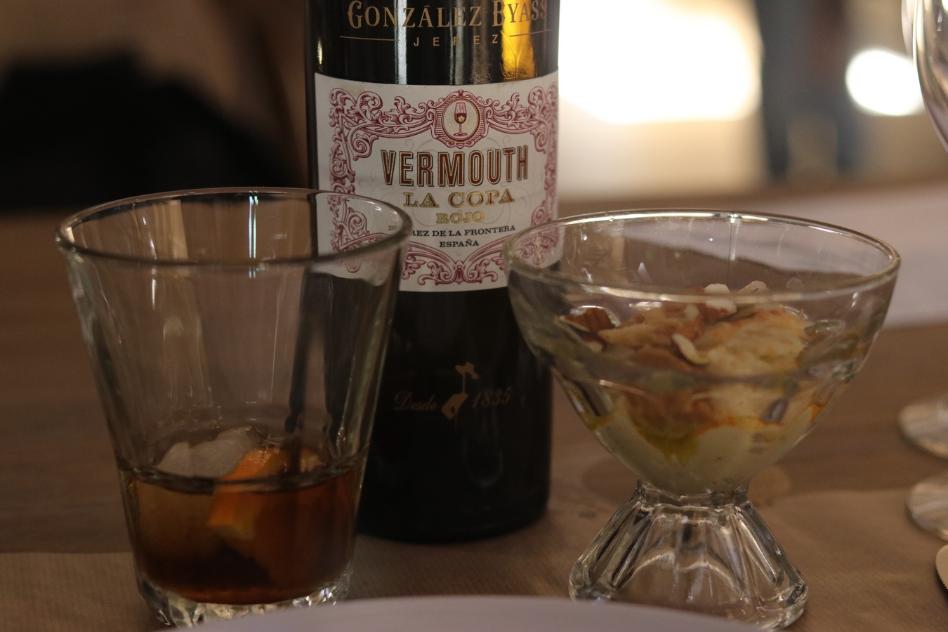 De entrada, degustamos Bocado de bacalao, brandada y almendras con dos vinos “atípicos”, un vino de aperitivo con base de fino, aromatizado con limón y menta: CROFT TWIST. Un vino tipo cóctel con burbuja y de baja graduación que es una delicia, refrescante, agradable al trago y del que te beberías la botella. En copa muy agradable, pero también lo es como coctel o incluso entre platos como sorbete. Pruébenlo, les sorprenderá. La segunda propuesta para este plato era Vermouth rojo La Copa. Si te gusta el jerez y el vermouth, este es el tuyo. Equilibrado en el dulce y amargor, con carácter de oloroso y sobre todo fresco. En nariz destacan aromas de piel de naranja, sutil canela y caramelo. Ambos son de González Byass Jerez