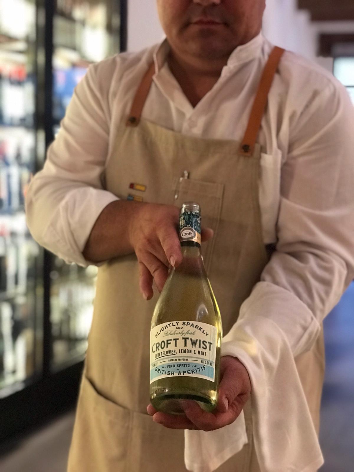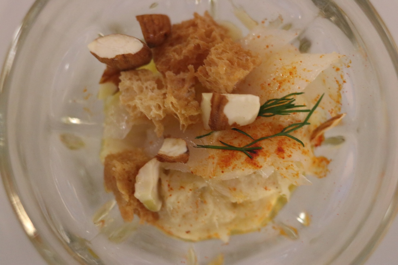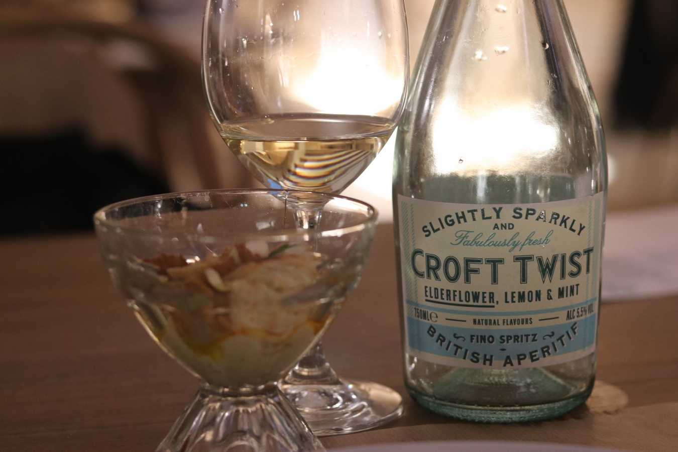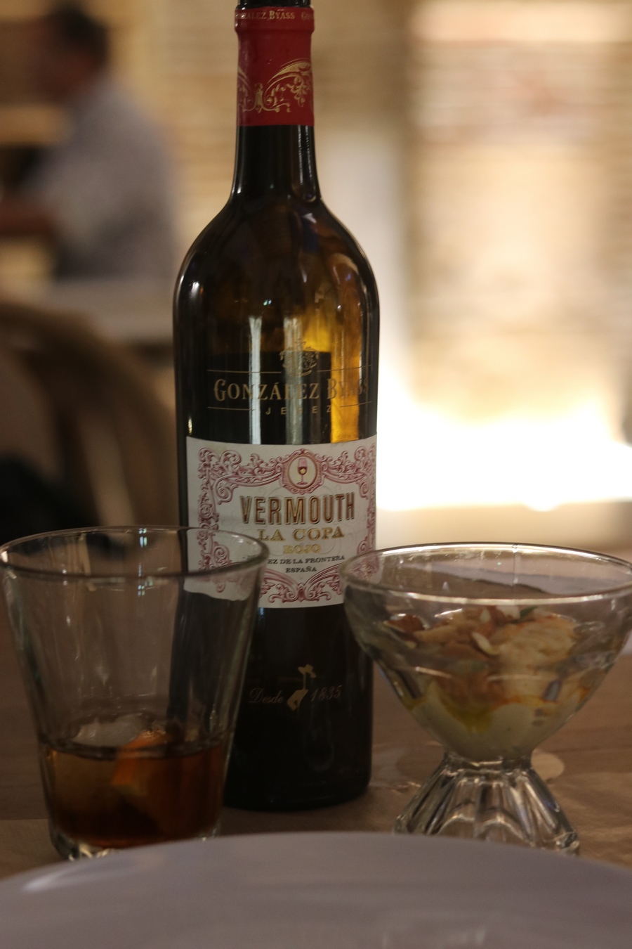 De entrada, degustamos Bocado de bacalao, brandada y almendras con dos vinos “atípicos”, un vino de aperitivo con base de fino, aromatizado con limón y menta: CROFT TWIST. Un vino tipo cóctel con burbuja y de baja graduación que es una delicia, refrescante, agradable al trago y del que te beberías la botella. En copa muy agradable, pero también lo es como coctel o incluso entre platos como sorbete. Pruébenlo, les sorprenderá. La segunda propuesta para este plato era Vermouth rojo La Copa. Si te gusta el jerez y el vermouth, este es el tuyo. Equilibrado en el dulce y amargor, con carácter de oloroso y sobre todo fresco. En nariz destacan aromas de piel de naranja, sutil canela y caramelo. Ambos son de González Byass Jerez