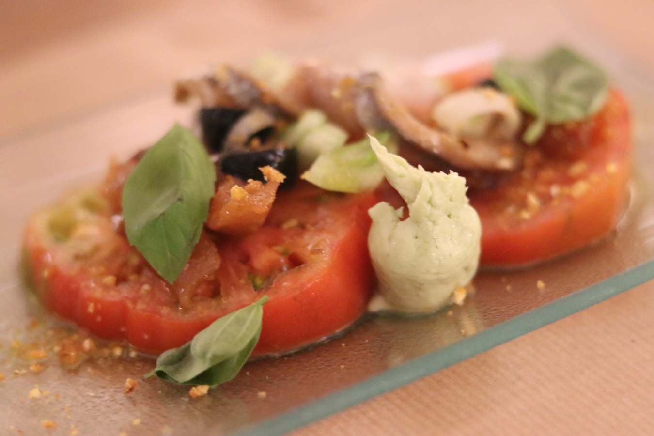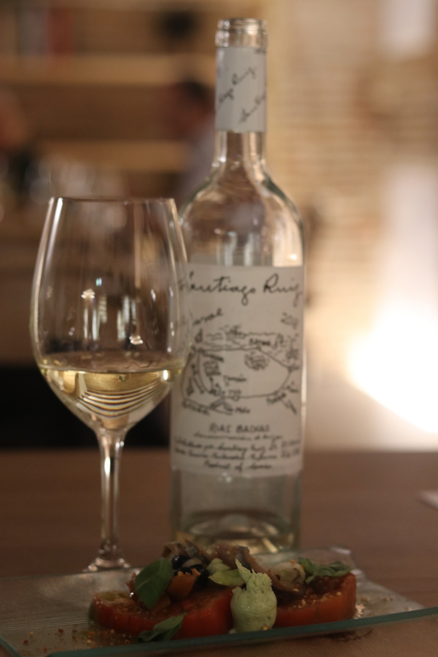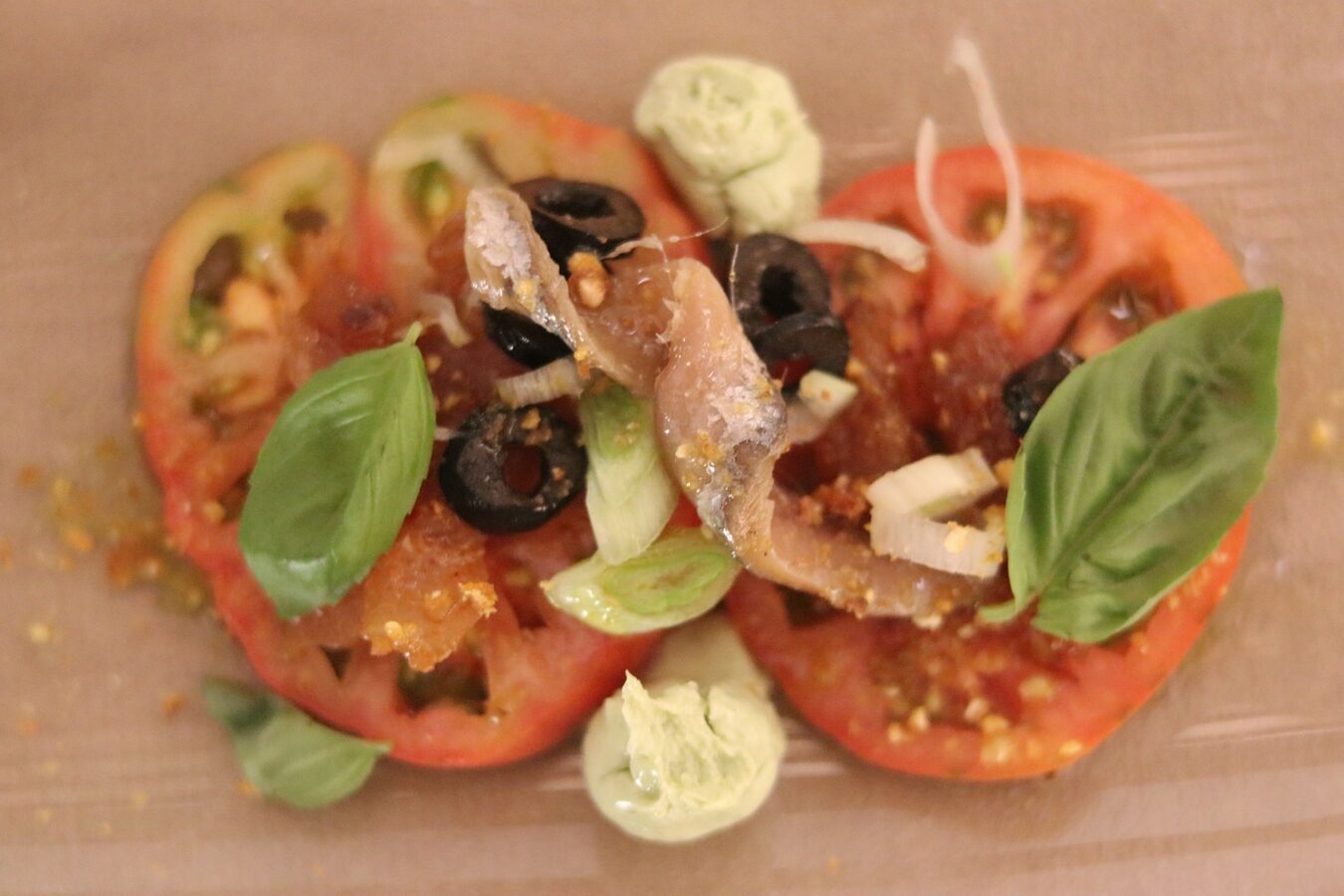 El segundo plato era Ensalada l’Almadraba con tomate rosa. Para esta propuesta, dos vinos blancos muy distintos pero con carácter.