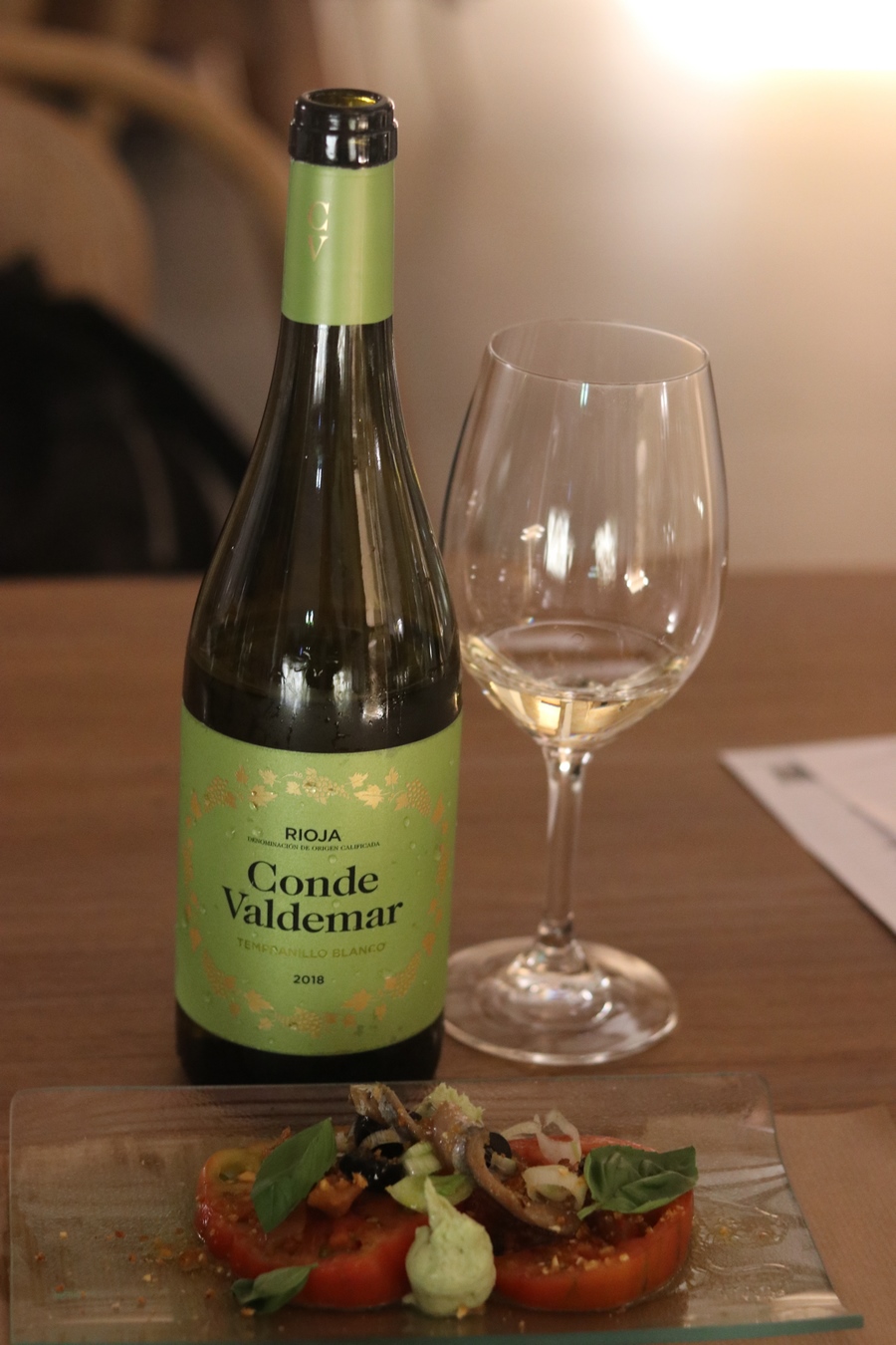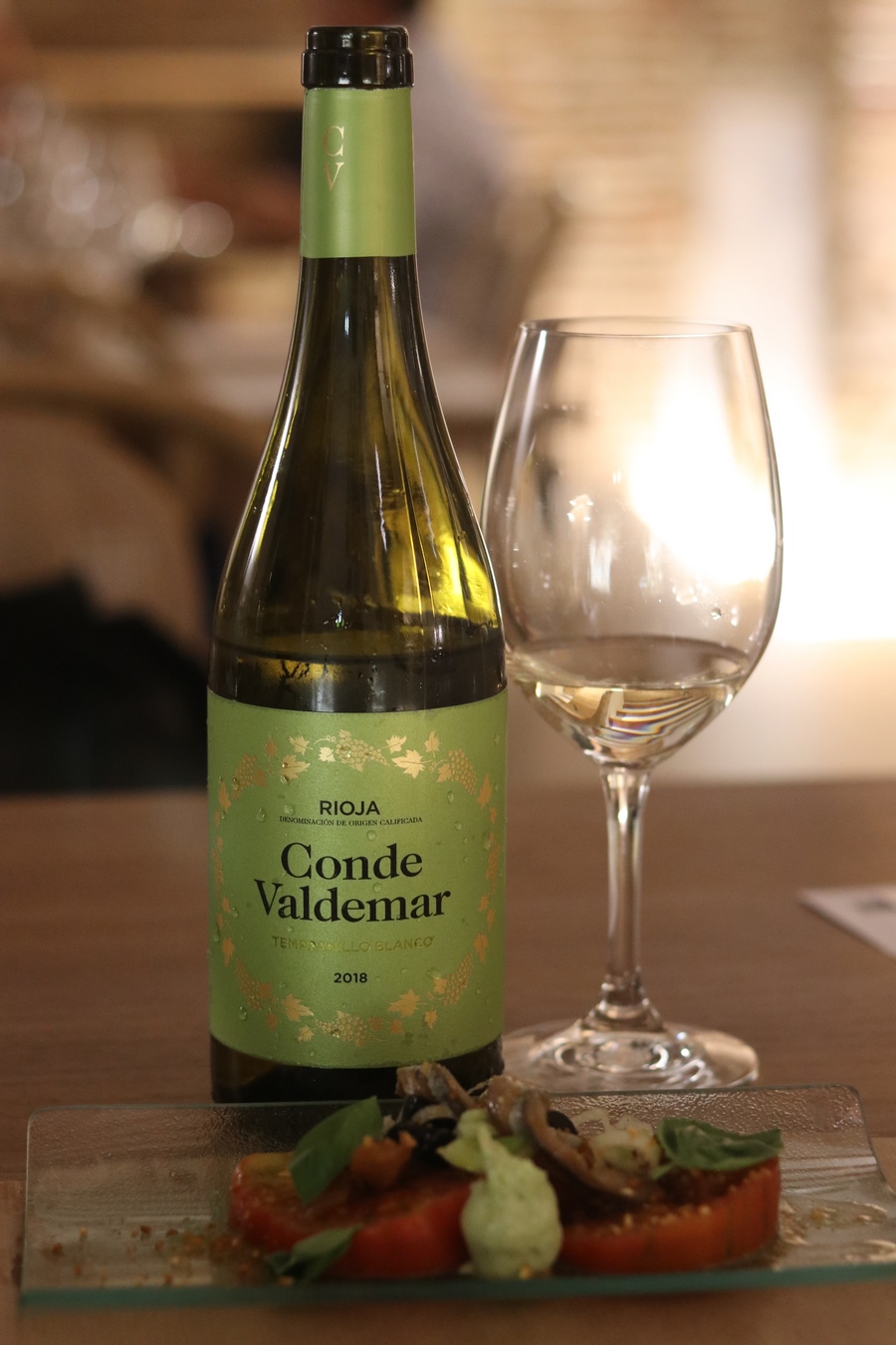 Conde Valdemar Tempranillo Blanco 2018 de Bodegas Valdemar. Fresco, cargado de aromas de fruta blanca, sobre todo manzana, sutiles toques florales, cítricos y algo de fruta tropical. En boca es untuoso, con buena acidez y persistencia. Es un vino acogido a la D.O. Ca. Rioja.