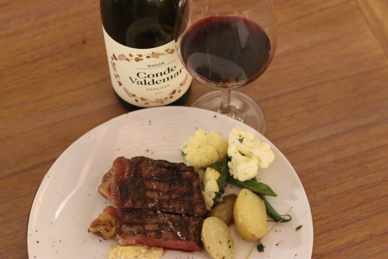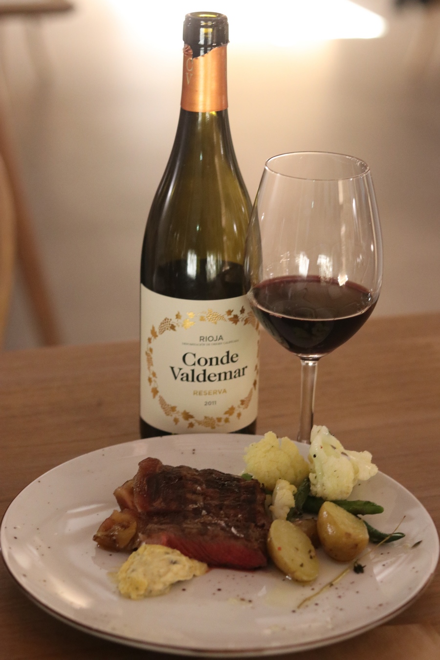 Una cena armonizada de este nivel no puede dejar de tener una carne de primera, y el último plato previo al postre fue Taco chuleta vacuno selección Premium a la brasa. Una carne soberbia, en su punto, lástima que siempre llega al final cuando es difícil terminar con todo el plato. Para este vino pusimos otro “clásico” como Conde Valdemar Reserva 2012 de Bodegas Valdemar. Aquí vamos a un vino que nos aporta especias dulces como la vainilla, el clavo y la sutil pimienta acompañada de cuero, tabaco y fruta escarchada. En boca, es territorio rioja. Pura seda, con una acidez que te hace sonreír y mirar la copa para que no falte vino.