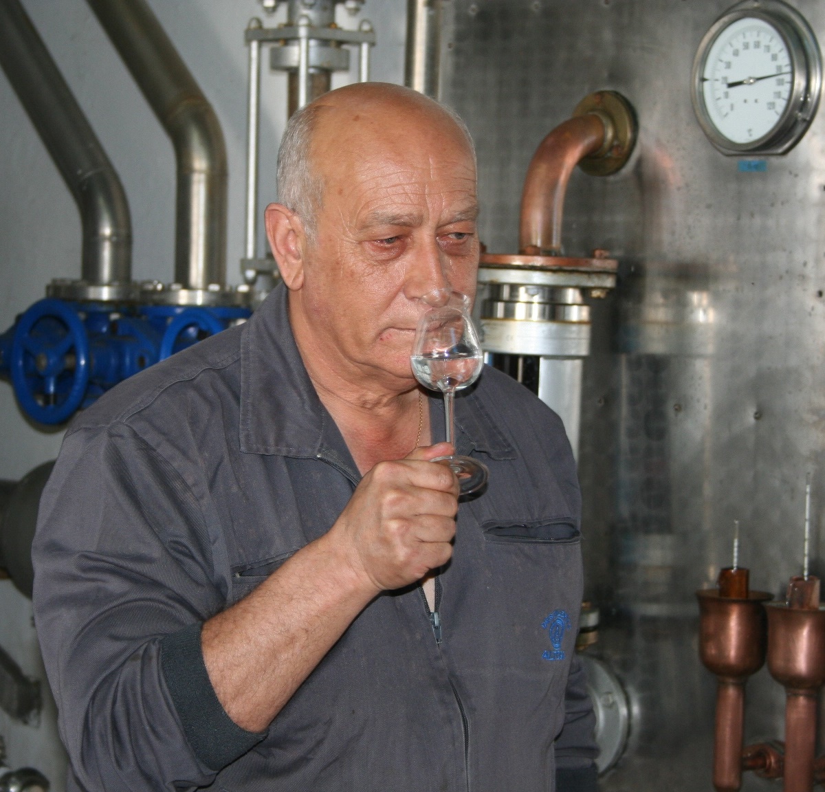 Con la piel curtida de alguien que lleva trabajando toda su vida, dedicado a un único oficio para el que no hay más escuela que el de estar al pié del “fogón”, el de destilar, sabedor de que no puede mejorar la materia prima que recibe, pero si podría empeorarla. Con el oficio aprendido de su padre y que ahora transmite a su hijo… quien sabe si también a su nieto. Todos, las cuatro generaciones con un mismo nombre: Juan Antonio Carrasco. Me recibe entre ruidos y calor en su lugar de trabajo, la sala de destilación de destilerías ALTOSA.
