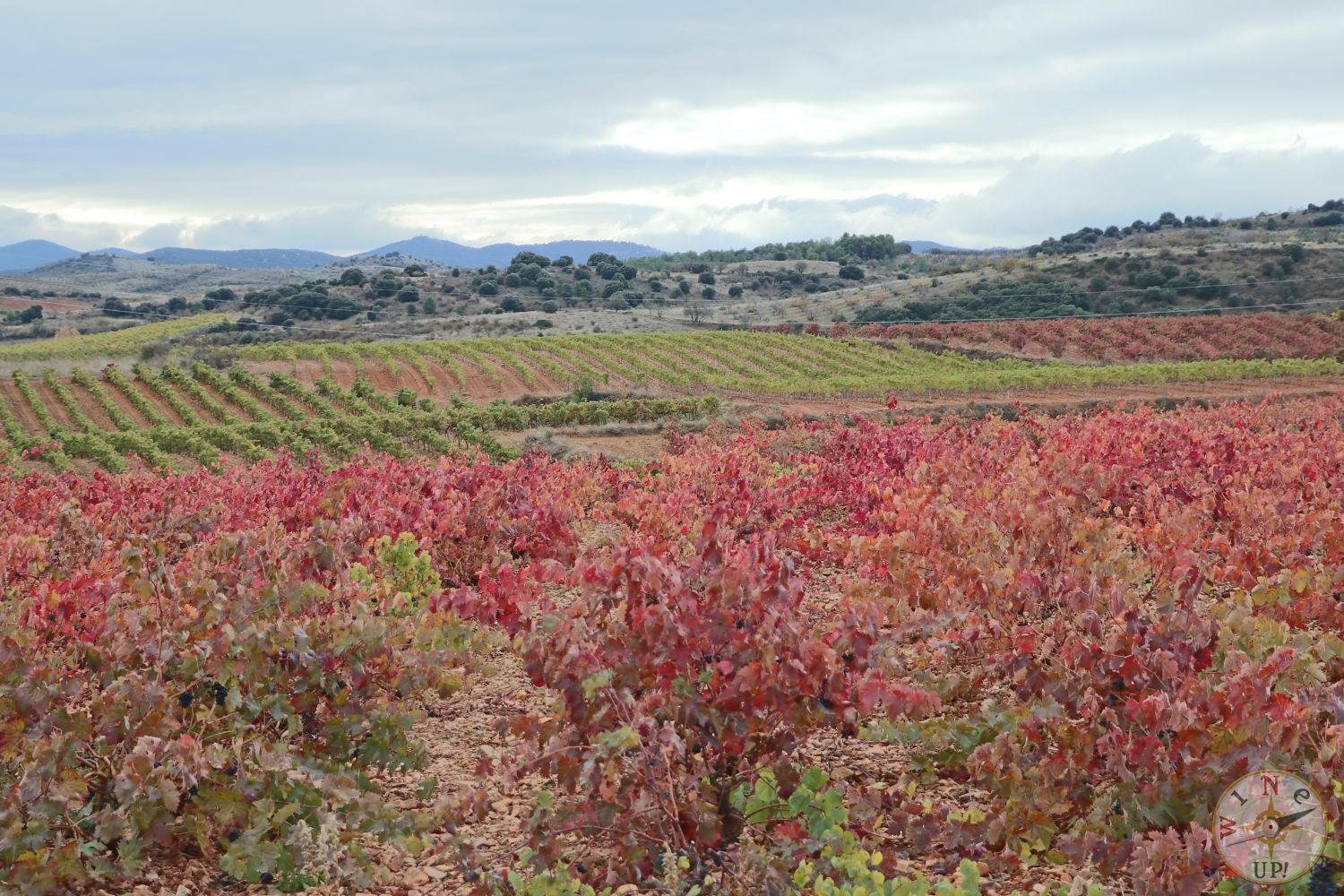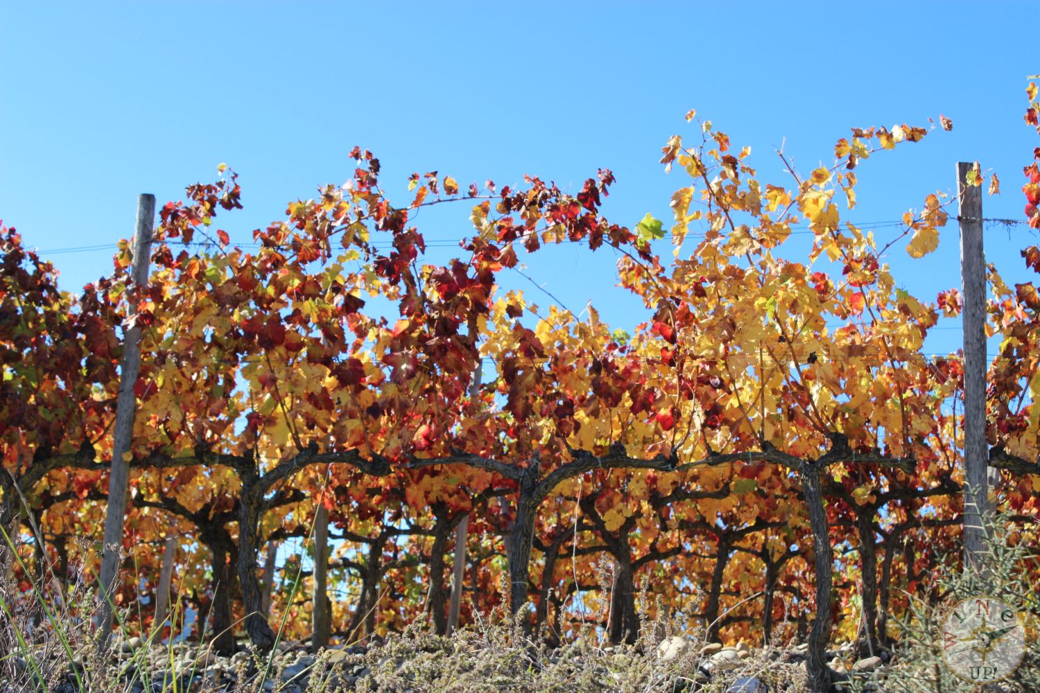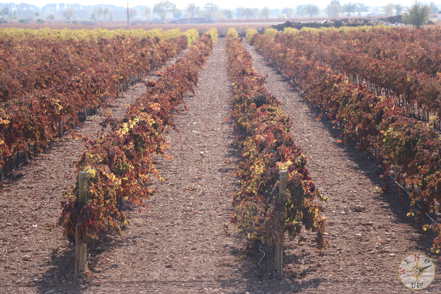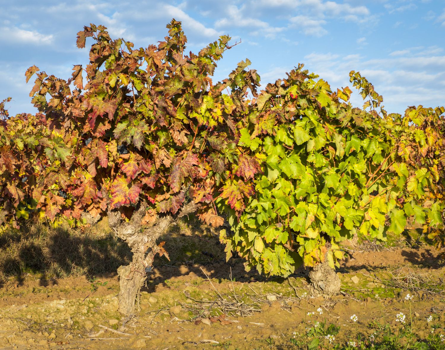 Sin embargo, para disfrutar de los colores no es necesario estar dentro de la viña. En esta época se nos muestra un abanico de color que difícilmente se puede encontrar en otro cultivo. Cada variedad de cepa nos mostrará una tonalidad diferente que va cambiando según nos acercamos a diciembre, la hoja se va cayendo y aumenta el contraste de color entre el blanco – rojizo de la tierra con el marrón oscuro de la cepa y los tonos que varían desde el verde intenso hasta el rojo, pasando por tonos ocres, naranjas, marrones, beige, oro…
