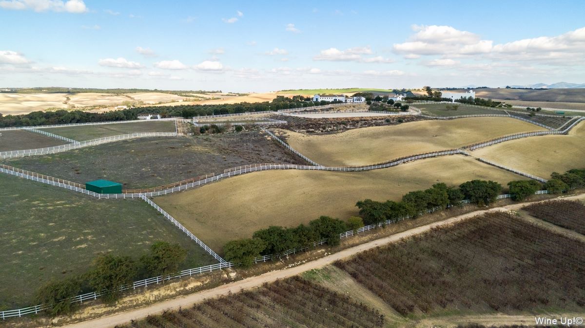 Todo en la bodega es armonía. bien dimensionada y con una construcción pensada en el trabajo y con unas vistas espectaculares que se disfrutan en una improvisada y privilegiada sala de catas: el balcón con vistas a la sierra de Grazalema y la finca. viñedos, pastos, zonas de entreno y corredero de caballos.