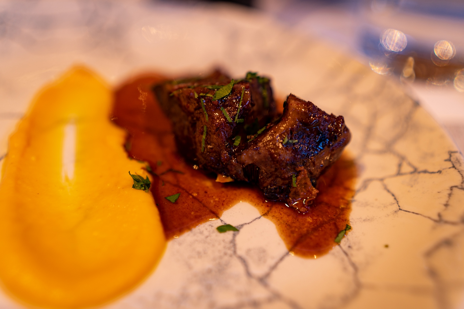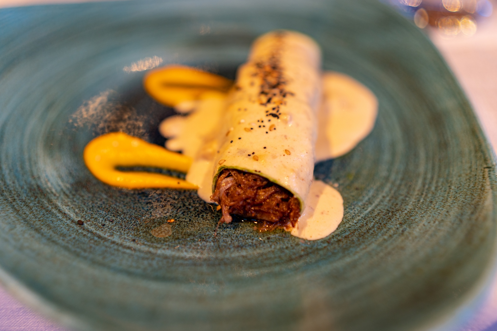 Canelón de Calabacín relleno de Guiso de Rabo de Toro Tradicional con Bechamel de Setas y Trufa y Crema de Calabaza armonizado con: