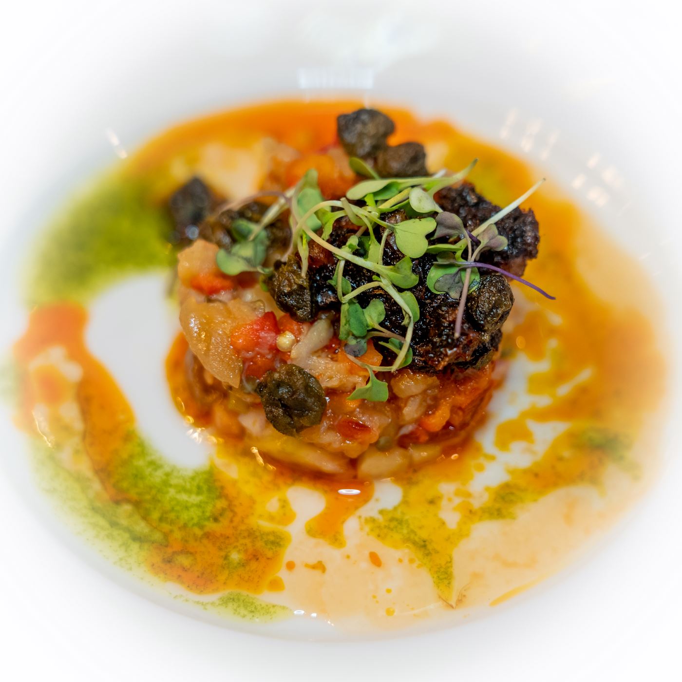 2. Coca de sardina ahumada con tartar de tomate verde y datil armonizado con: