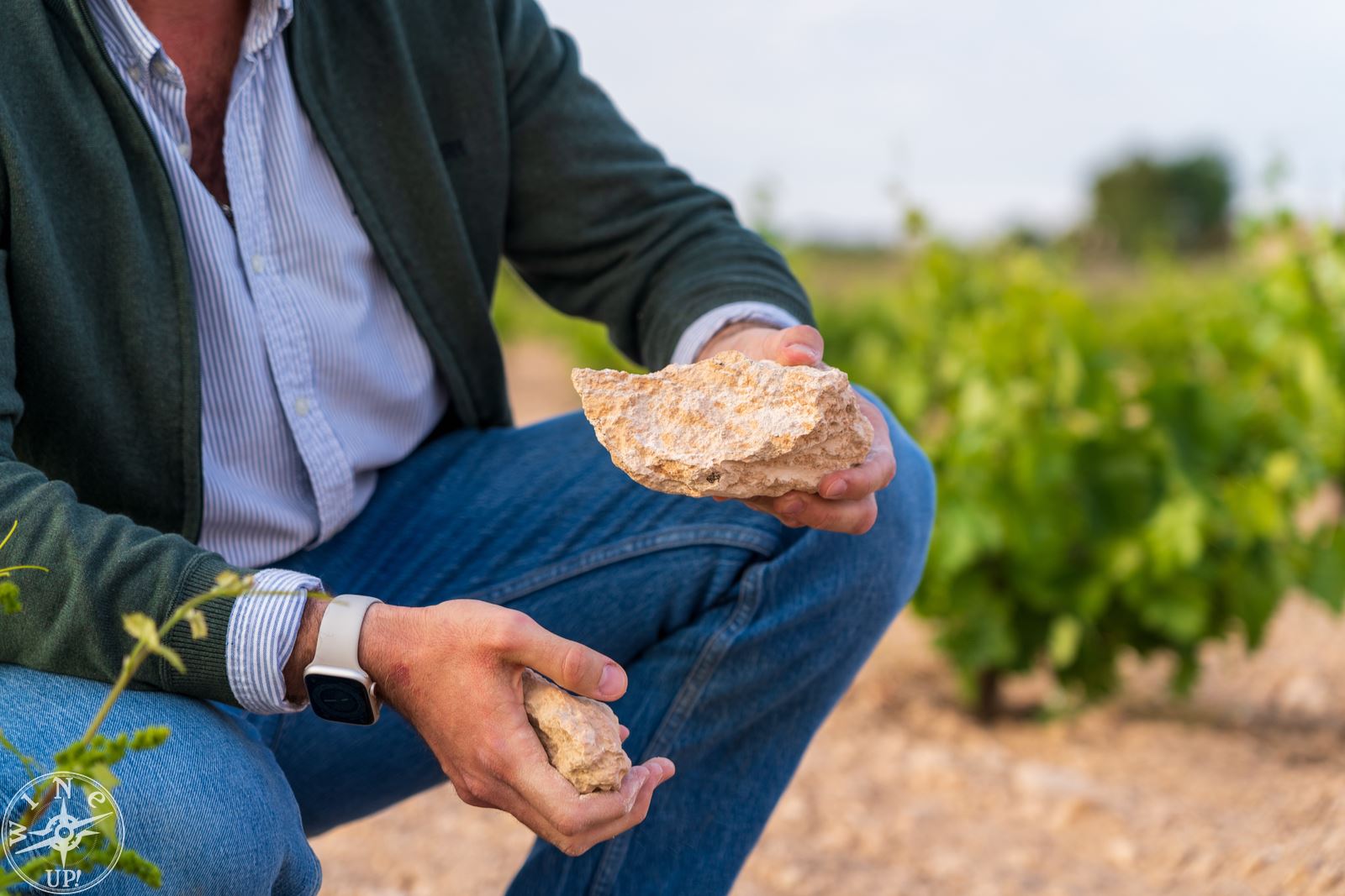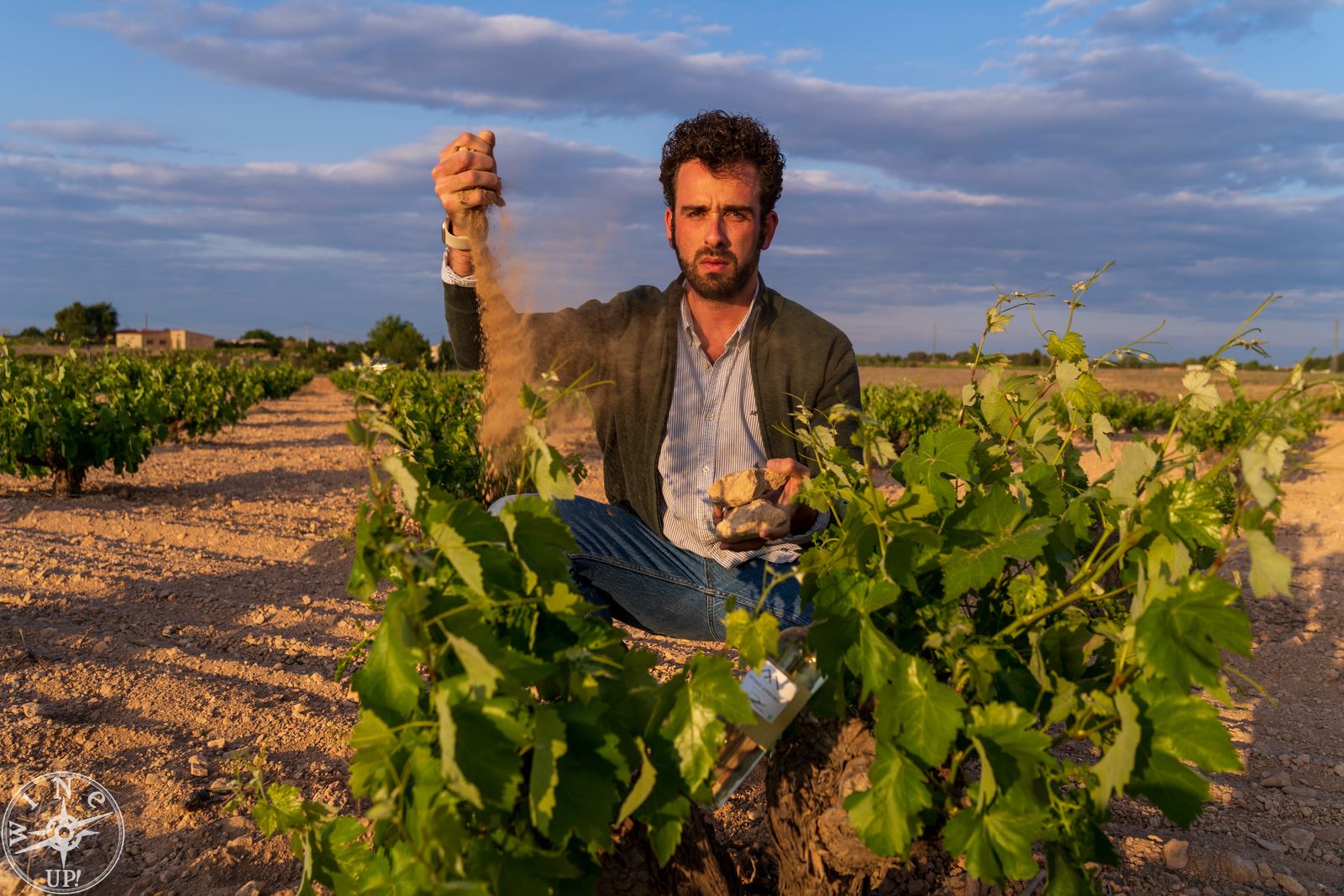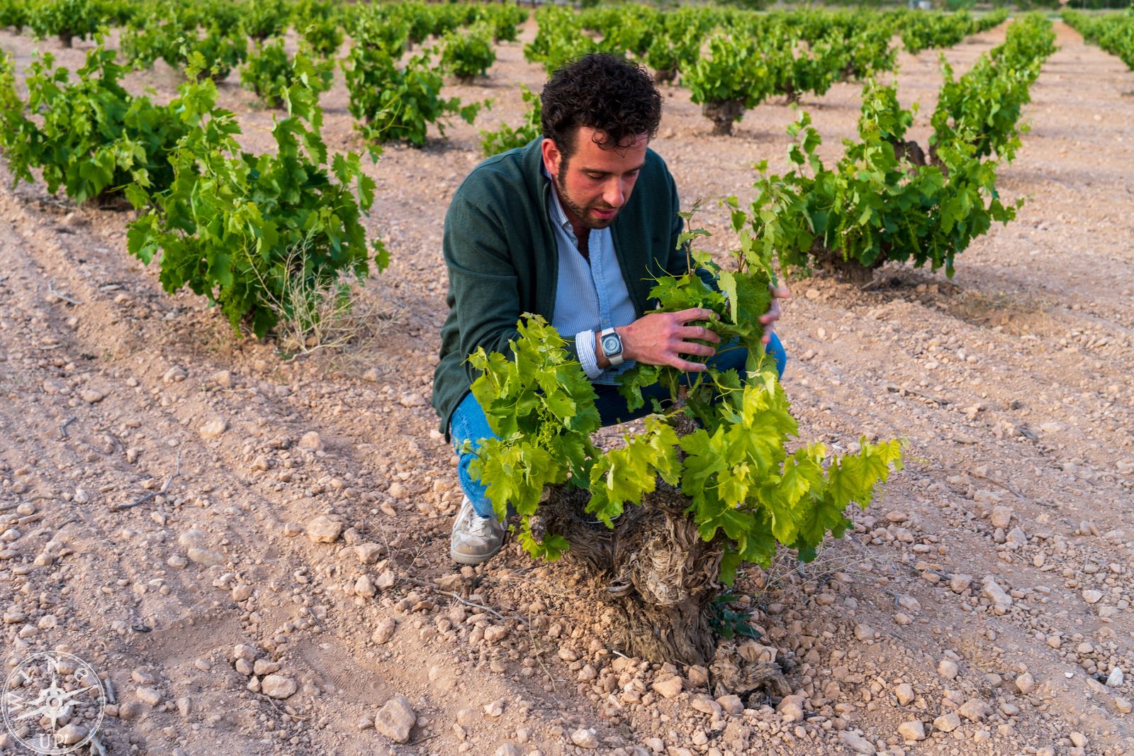 La visita a la bodega es siempre obligada, pero el viñedo es imprescindible, y ahí, en un viejo Land Rover Santana nos dirigimos a una de esas viñas rescatadas de la espaldera, ésta de variedad airén. Con una tierra arenosa, salpicada por piedra caliza, pobre en materia orgánica que obliga a la planta a profundizar con sus raíces, este año además, extremadamente seca.