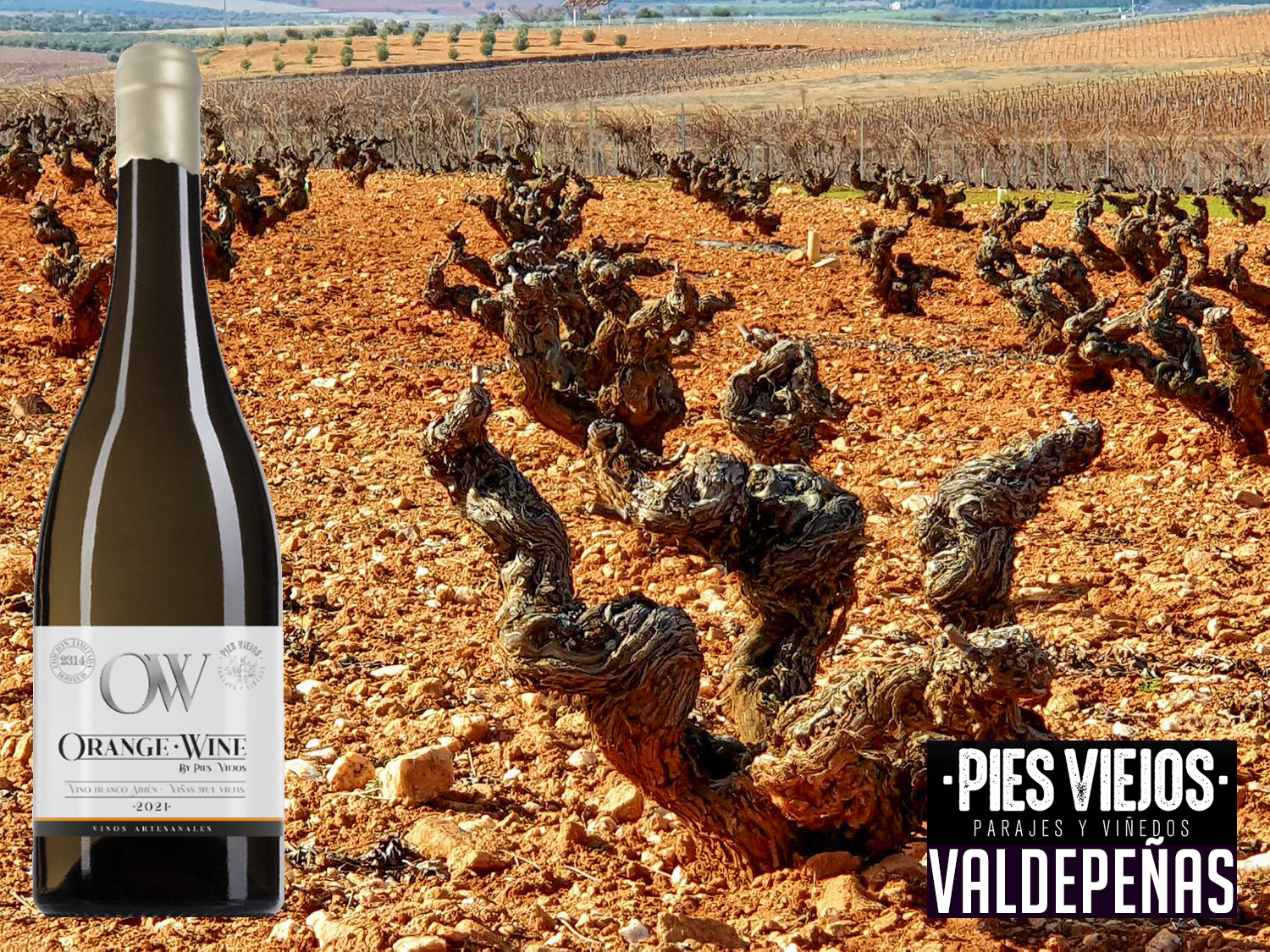 ORANGE WINE BY PIES VIEJOS 2021, Airén de viñas viejas, fermentado y criado en huevos de barro con sus pieles durante 80 días para pasar otros 10 meses de crianza en huevos de barro y 12 meses de afinamiento en botella.
