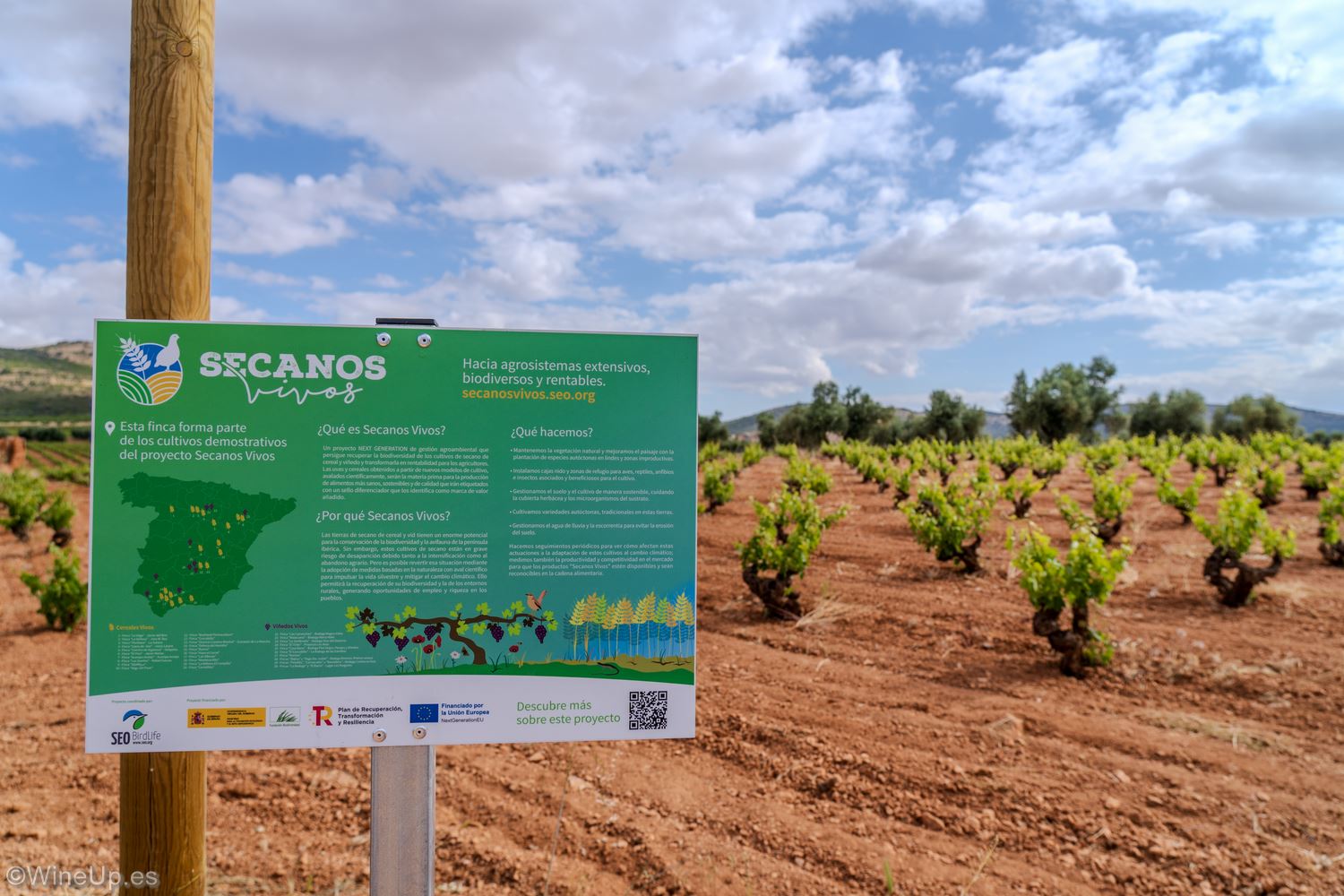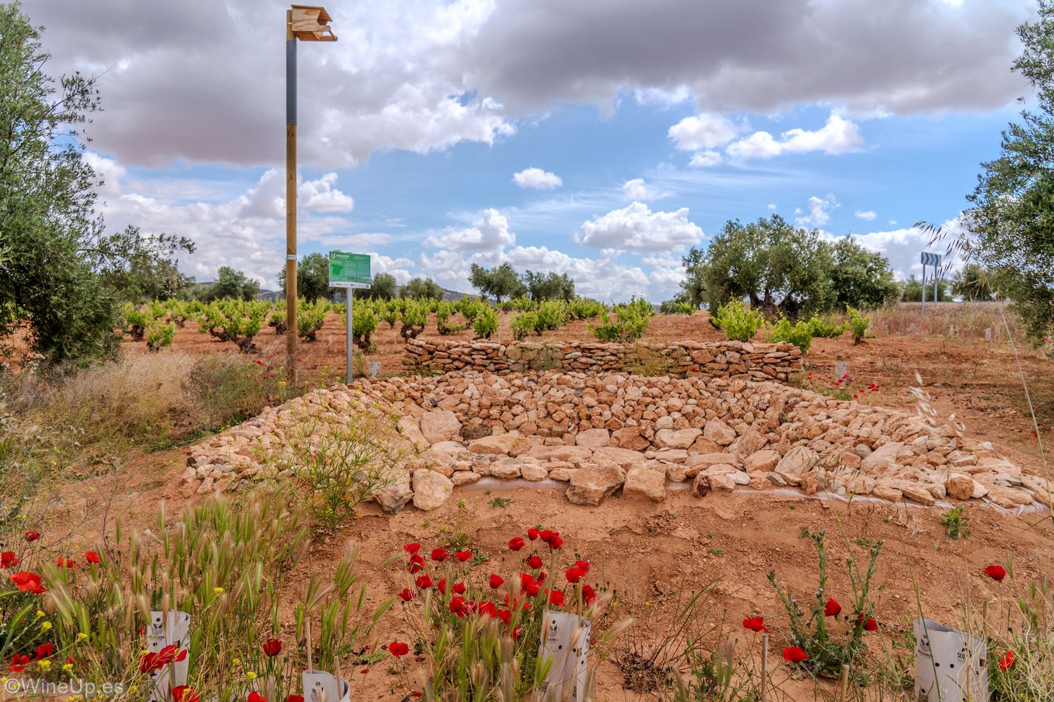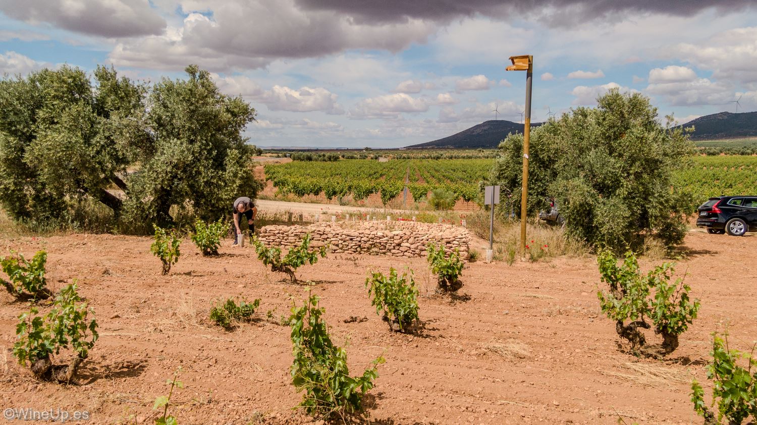 En Valdepeñas está la bodega, pero el viñedo principal, “Finca casa ranas”, muy próximo a San Carlos del Valle, donde ya empieza a intuirse un cambio de comarca, pasando de La Mancha al campo de Montiel. Sus cerca de 800 mts. de altitud ayudan a tener noches frescas, sin embargo, el sol castiga de forma implacable durante el día, lo que permite, una correcta maduración de las uvas.