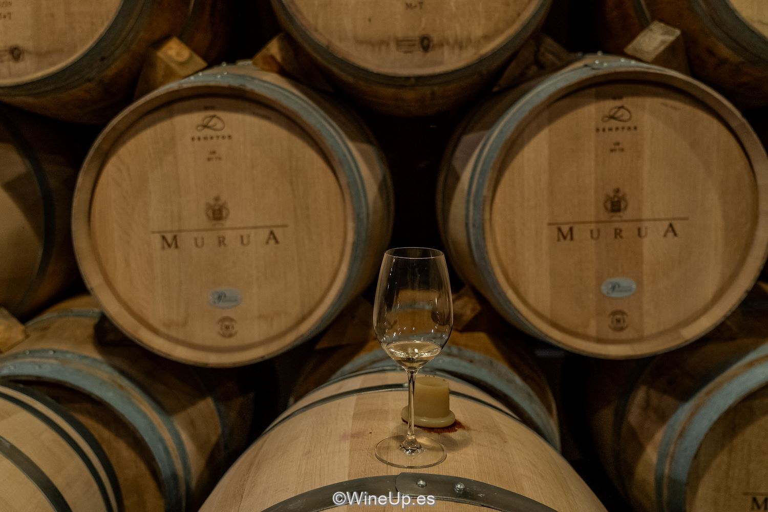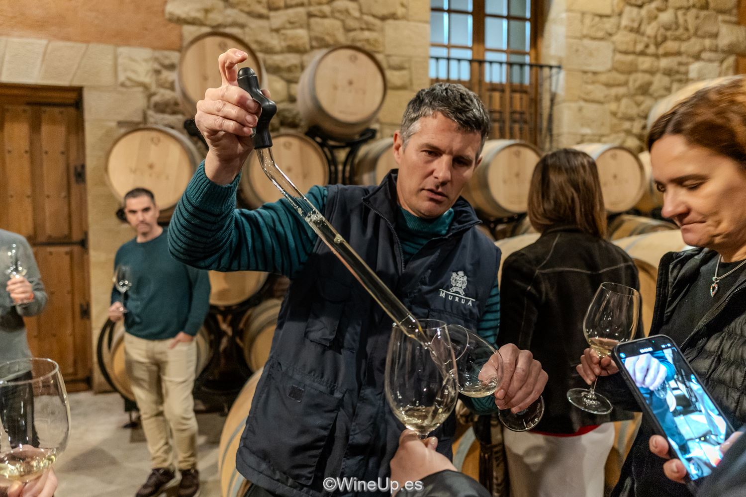 Murua está ubicada en Elciego, es propiedad de la familia Masaveu desde 1974. Aunque es una construcción reciente, han respetado la arquitectura tradicional de la zona. En la sala de elaboración, Mathieu compartió su filosofía con el viñedo y su forma de entender la viticultura para mostrar el origen y el territorio en sus vinos. Allí mismo, directamente de la barrica, catamos el primer blanco.